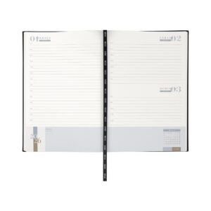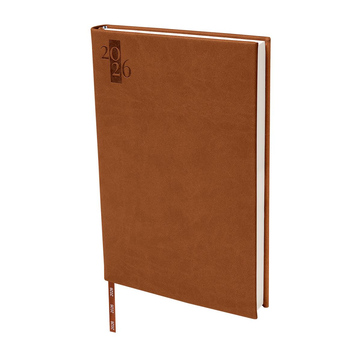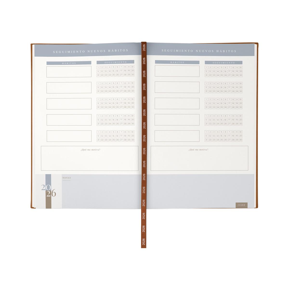 Agenda diaria con 186 hojas. Contiene datos personales, calendarios 2025-2026-2027, planeador 2026, presupuesto de gastos, seguimiento de nuevos habitos, organizador de tareas, planeador de proyecto. Incluye caja individual || Material: Curpiel || Tamaño: 14 x 21 cm