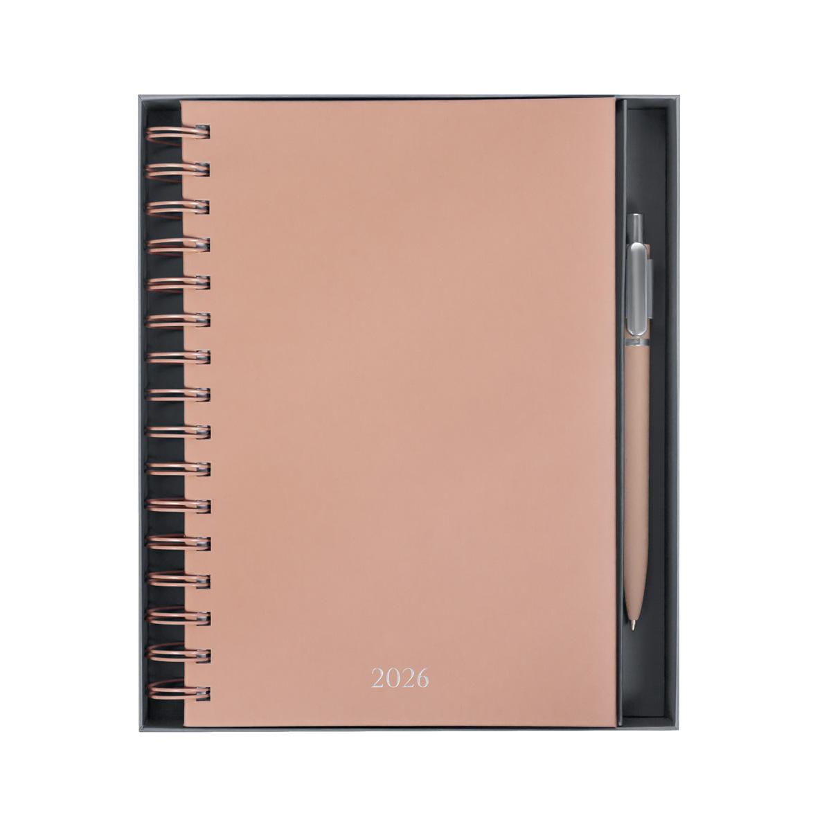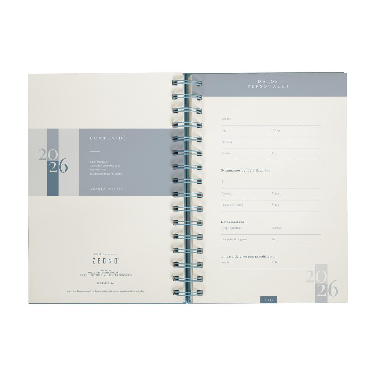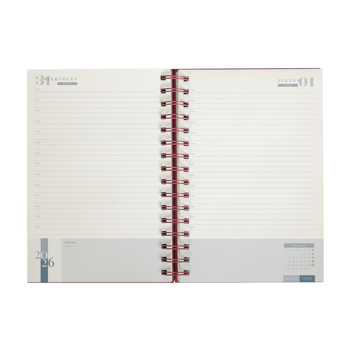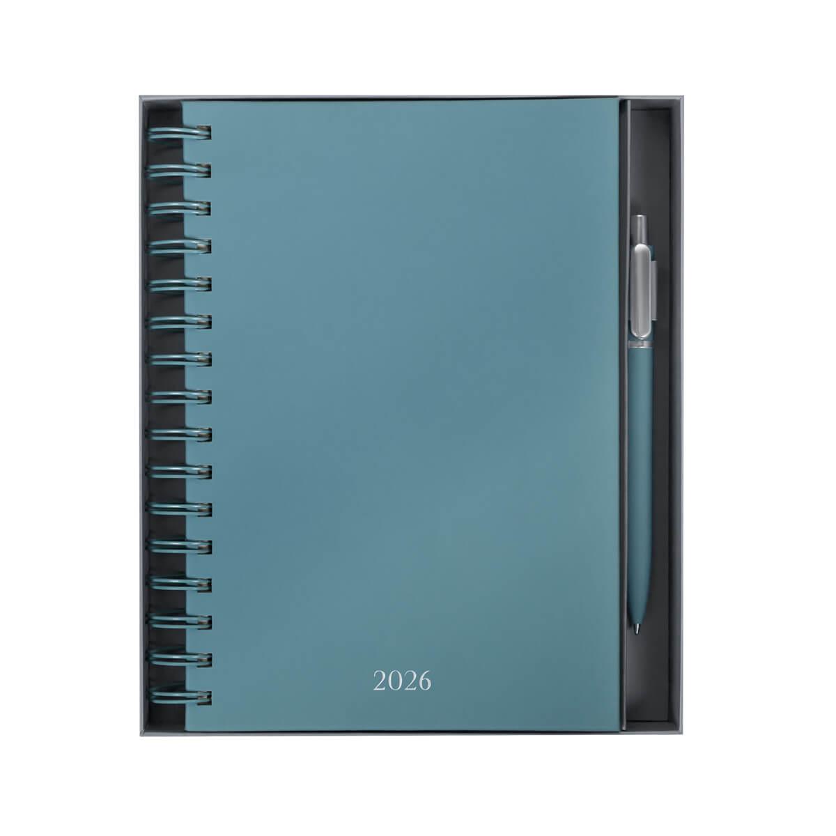 Agenda diaria con 174 hojas. Contiene datos personales, calendarios 2025-2026-2027, planeador 2026 y seguimiento de nuevos habitos. Incluye boligrafo metalico y caja individual tipo regalo || Material: Curpiel || Tamaño: 14.5 x 21 cm Agenda / 1 x 14 cm Bolígrafo