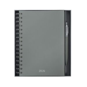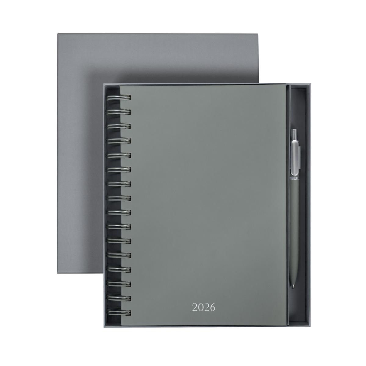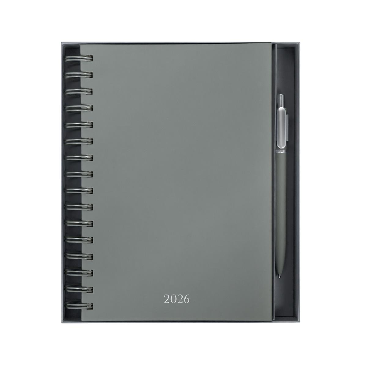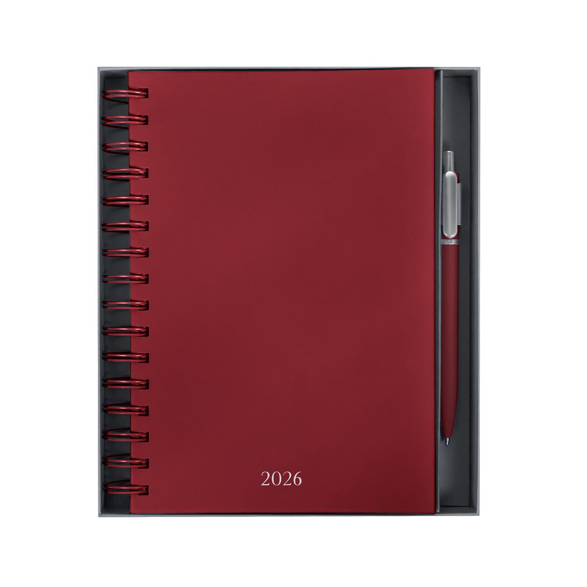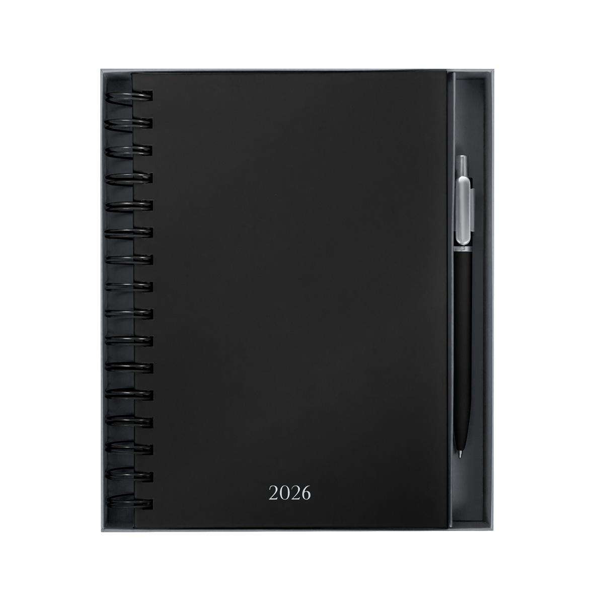 Agenda diaria con 174 hojas. Contiene datos personales, calendarios 2025-2026-2027, planeador 2026 y seguimiento de nuevos habitos. Incluye boligrafo metalico y caja individual tipo regalo || Material: Curpiel || Tamaño: 14.5 x 21 cm Agenda / 1 x 14 cm Bolígrafo
