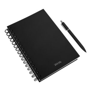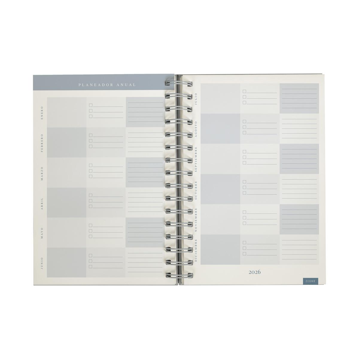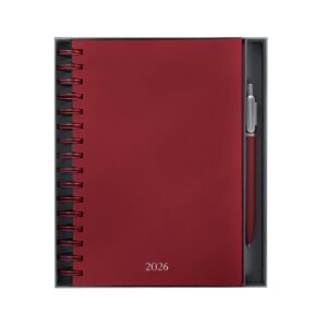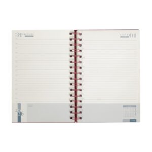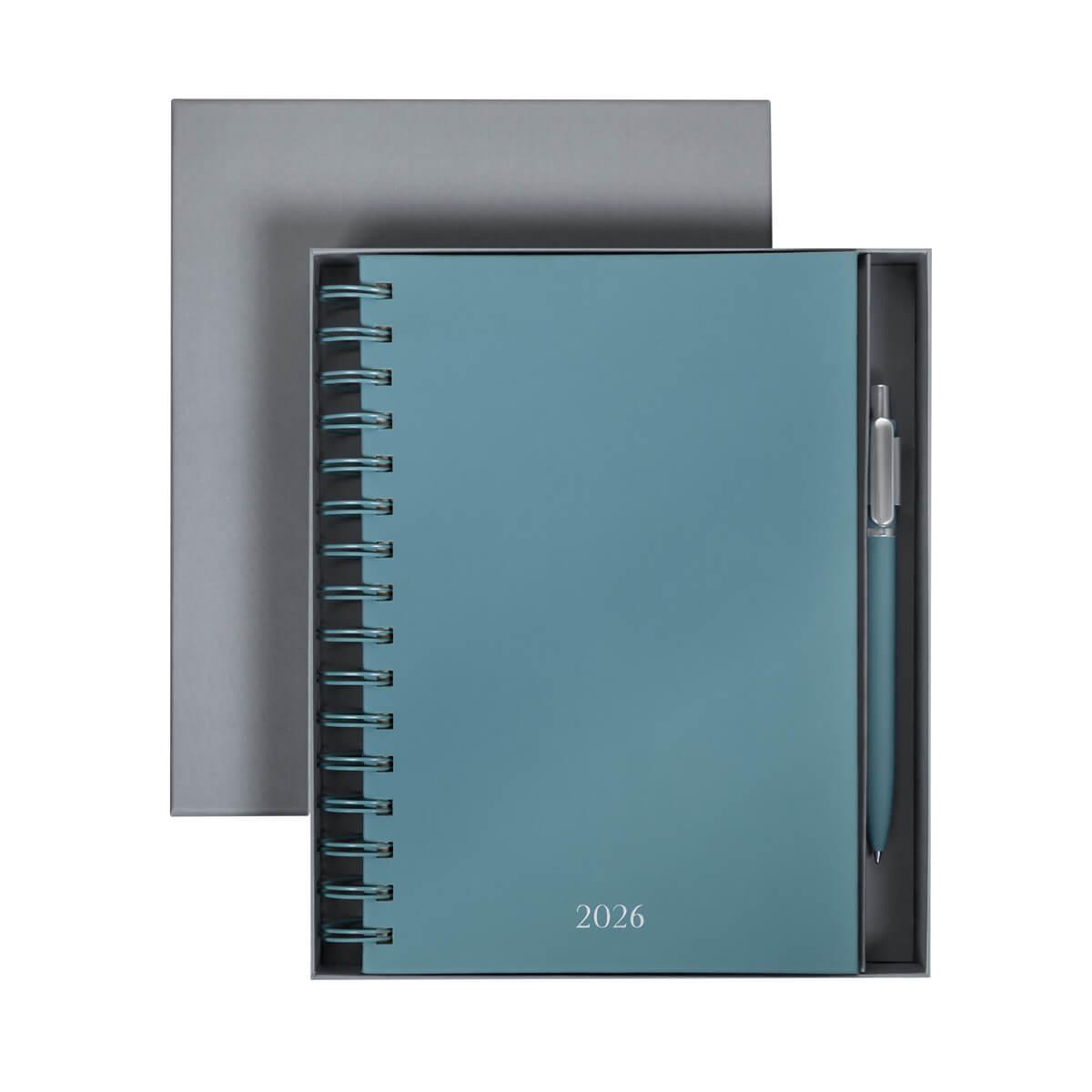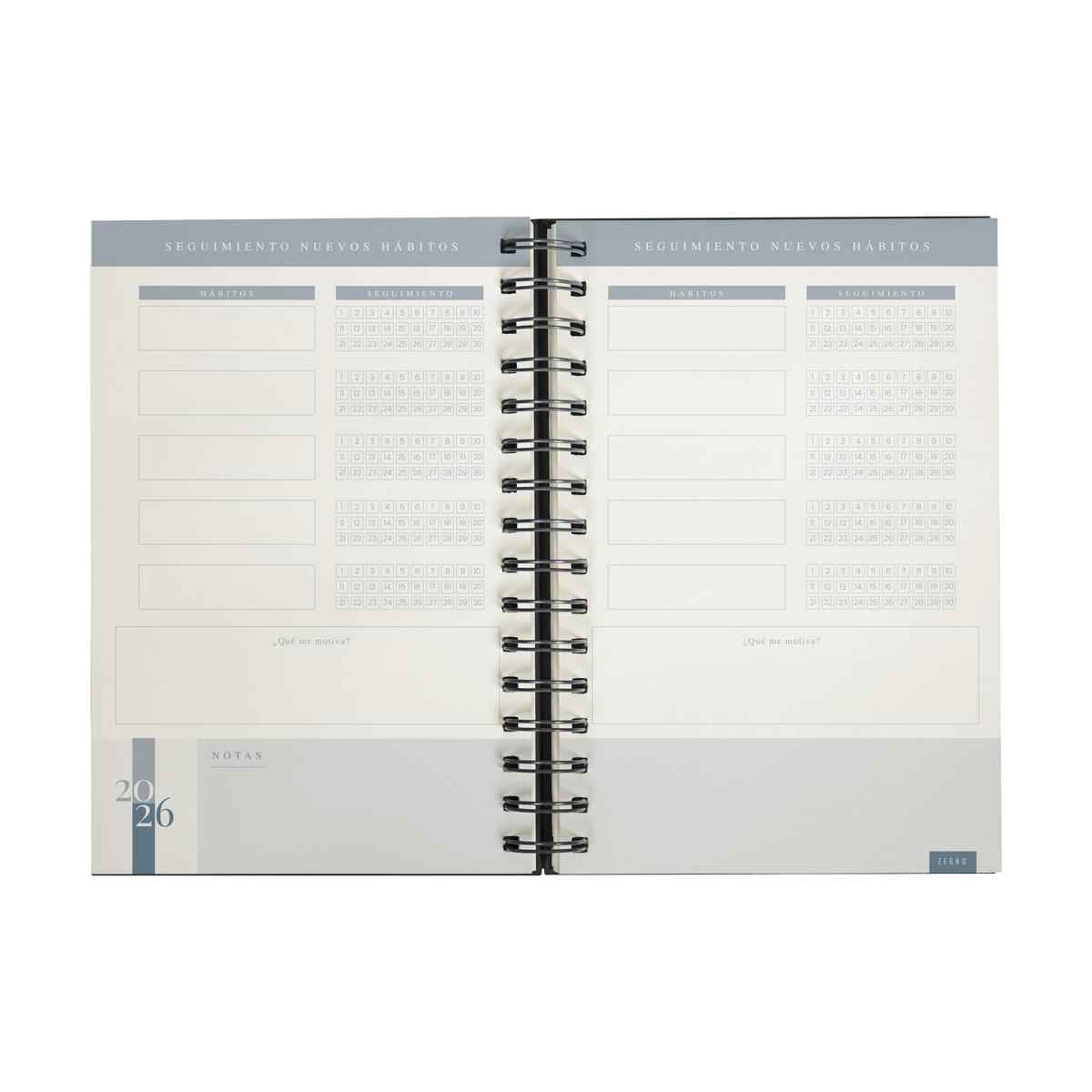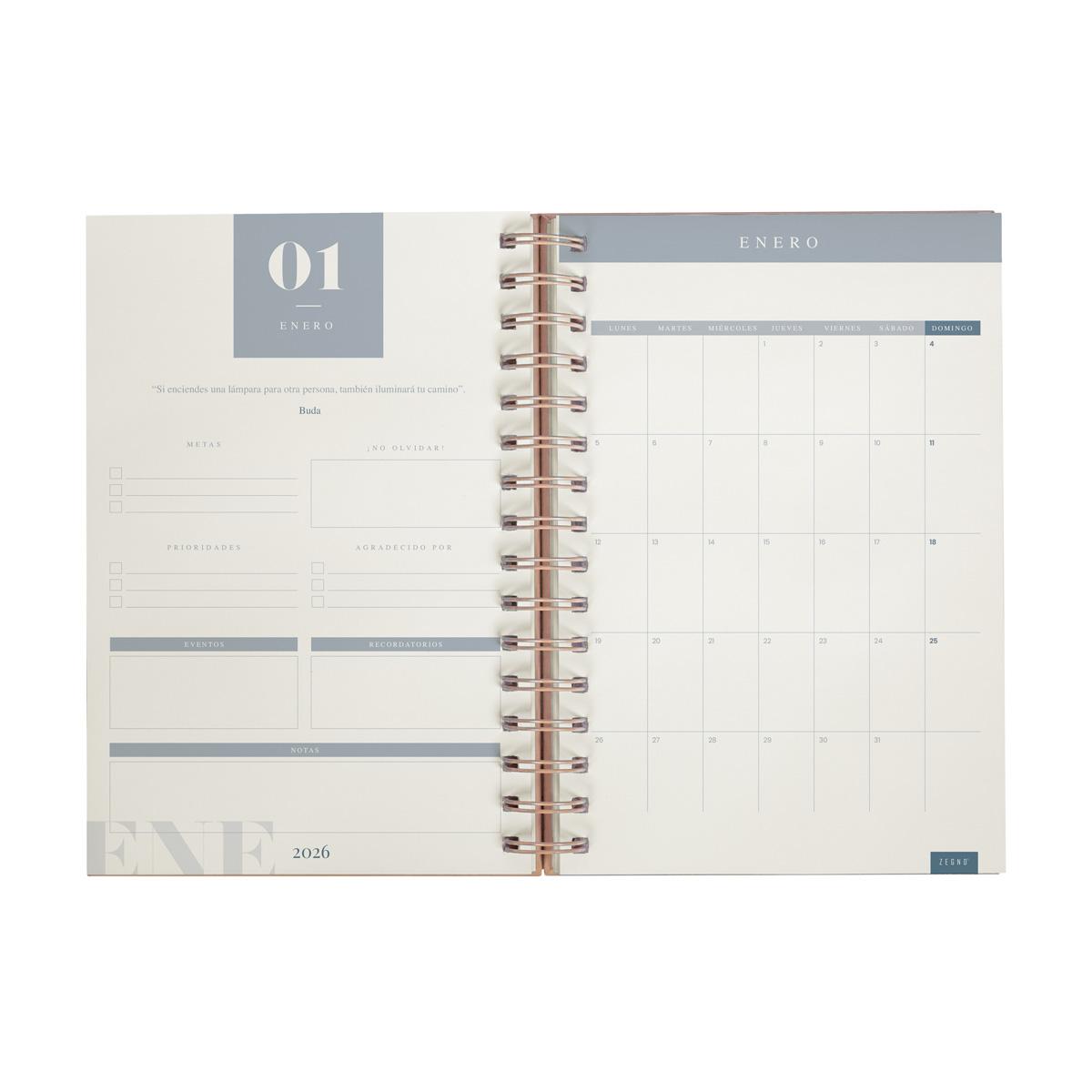 Agenda diaria con 174 hojas. Contiene datos personales, calendarios 2025-2026-2027, planeador 2026 y seguimiento de nuevos habitos. Incluye boligrafo metalico y caja individual tipo regalo || Material: Curpiel || Tamaño: 14.5 x 21 cm Agenda / 1 x 14 cm Bolígrafo