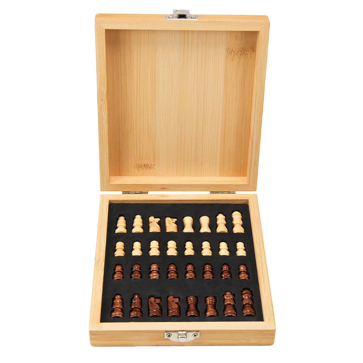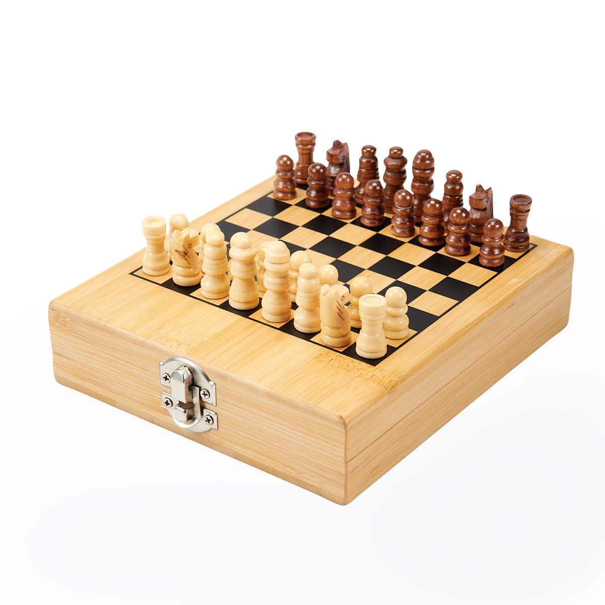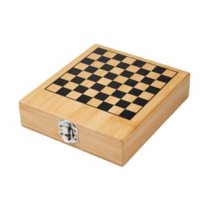 Fabricado en bambu, ideal para los amantes del juego estrategico que valoran la practicidad y el diseno. Incluye 32 piezas en dos tonos de madera (oscuro y claro), perfectamente proporcionadas y almacenables dentro de su propio estuche. El tablero esta impreso directamente sobre la tapa del estuche, lo que permite jugar comodamente y guardar todo con facilidad. Su broche metalico garantiza seguridad durante el transporte. La madera es un producto natural el cual puede presentar variaciones en tonalidades y vetas. Incluye caja Individual || Material: Bambú || Tamaño: 14.6 x 17.5 x 4.8 cm