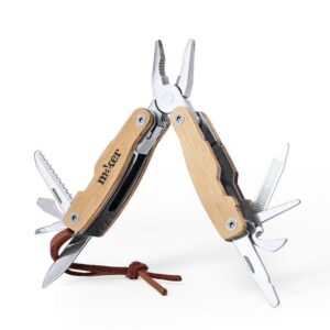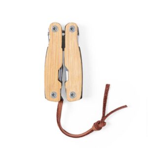 Herramientero 9 funciones en acero inoxidable con cuerpo en madera de bambu, con estuche en lona. De 7 x 3.1x 2.cm cerrado. – Impresion: Screen, tampografia metalica, laser Tamano Area Impresa: 6 x 1.8 cm. – Caja: 37 x 25 x 30 cm. 240 unidades 23 KG