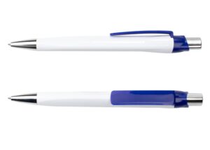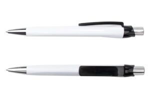 Boligrafo con barril blanco solido, clip de color solido, punta y empujador cromados. Su diseno combina acabados modernos con funcionalidad, ideal para uso diario en entornos laborales o academicos || Material: Plástico ABS || Tamaño: Diámetro de 0.9 cm