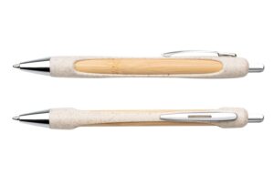 Boligrafo ecologico elaborado en bambu con cubierta de paja de trigo. Su clip y punta metalicos brindan un toque elegante al diseno. Sistema retractil. (Boligrafo/Esfero) || Material: Bambú + Paja de Trigo || Tamaño: Diámetro de 1.2 cm