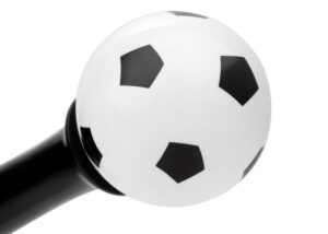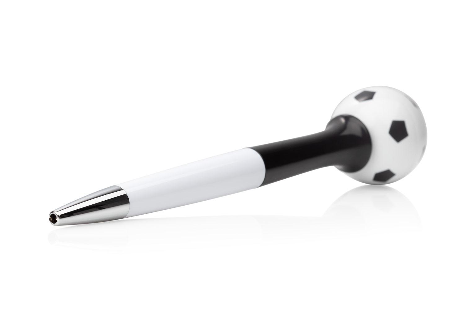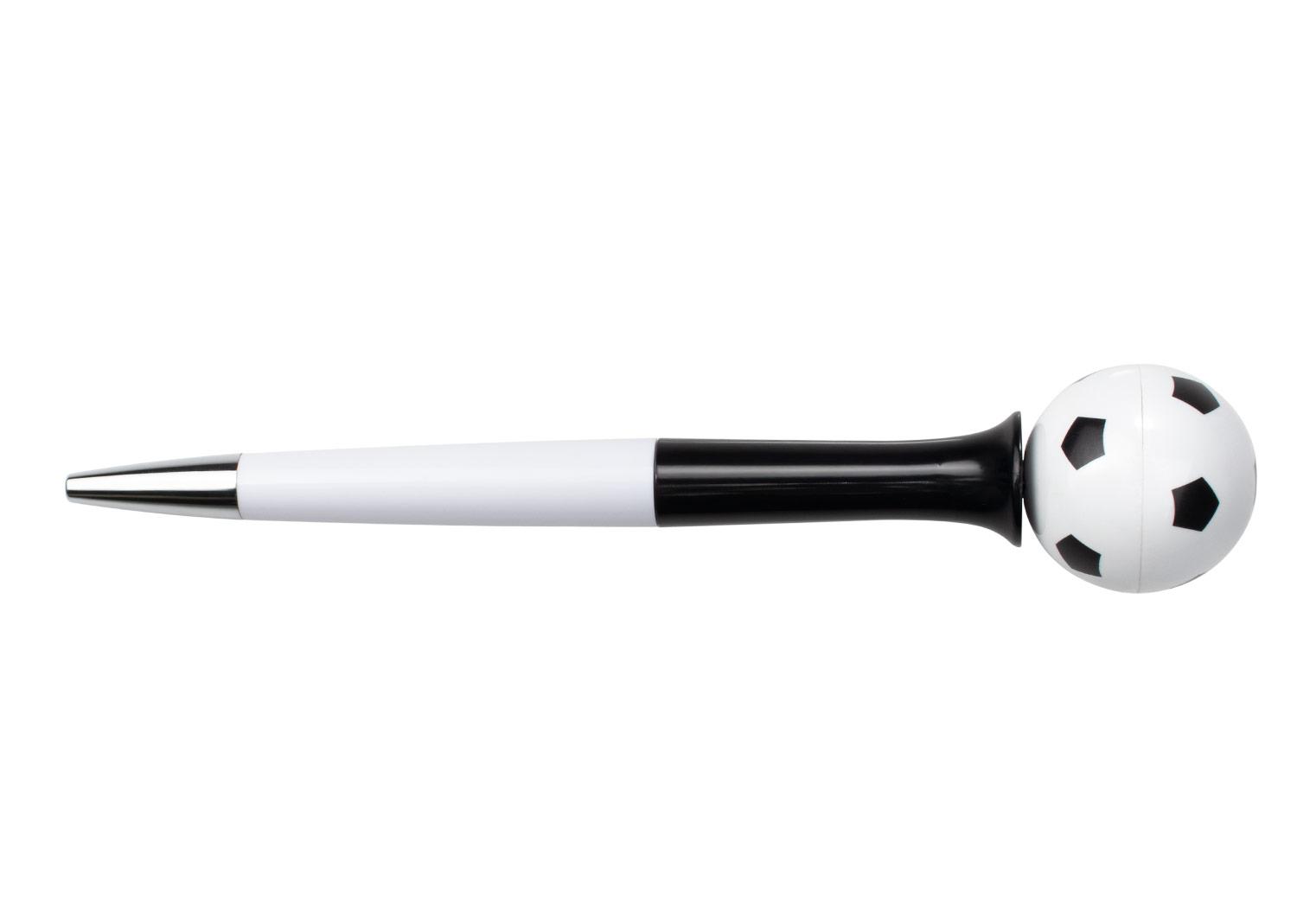 Boligrafo de accion giratoria con barril de color solido y punta cromada, ideal para los amantes del futbol. Su diseno incluye una esfera decorativa con impresion de balon en la parte superior, que gira suavemente para anadir un toque divertido y dinamico mientras escribes || Material: Plástico ABS || Tamaño: Diámetro de 2.8 cm