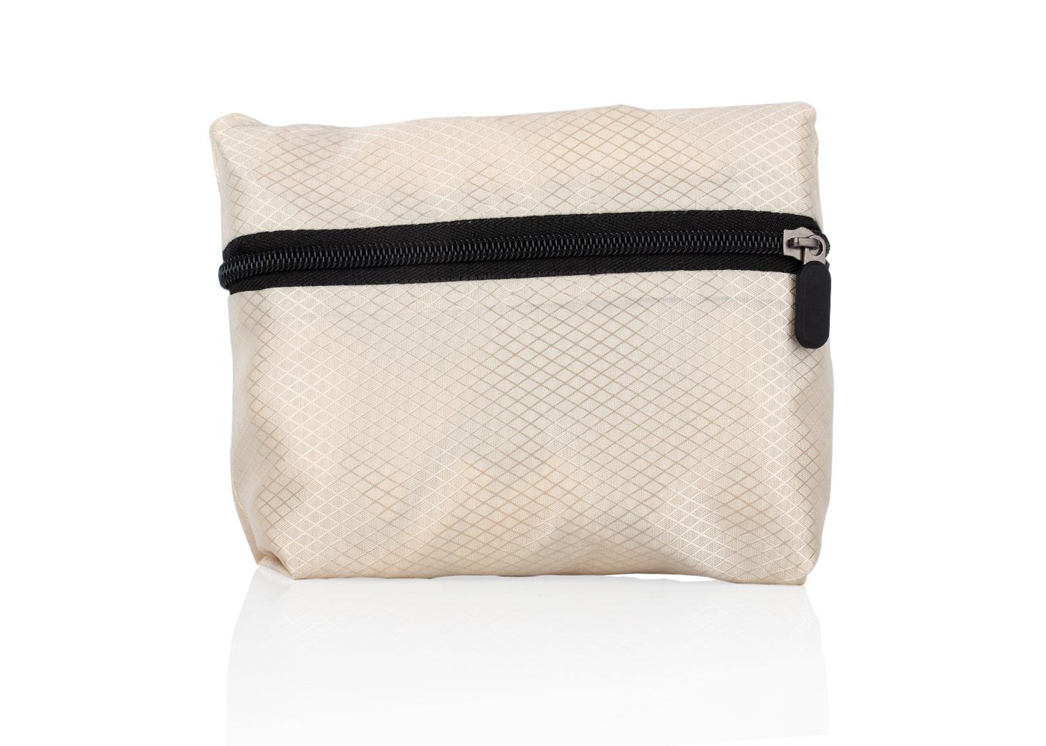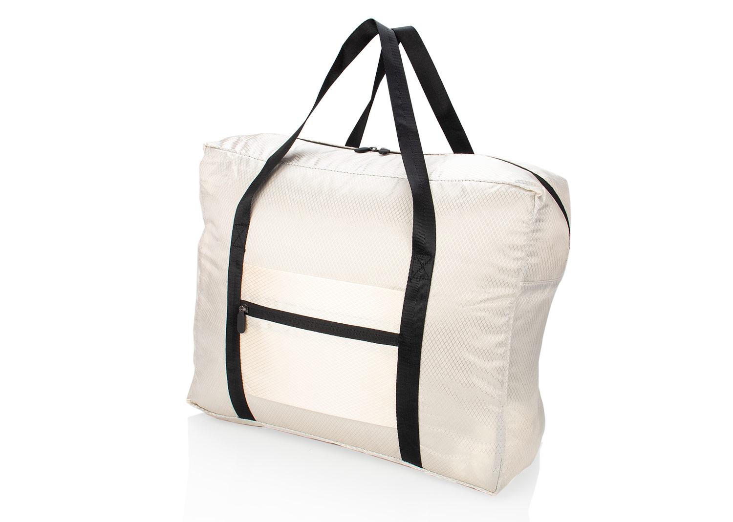 Bolso plegable con diseno funcional que incluye correas para sujetar al equipaje, facilitando su transporte en viajes. El bolsillo pequeno se convierte en estuche para guardar el bolso cuando no esta en uso, y la cremallera principal cuenta con doble carrito para mayor comodidad al abrir y cerrar || Material: Poliéster || Tamaño: 18.8 cm de ancho x 16.2 cm de alto