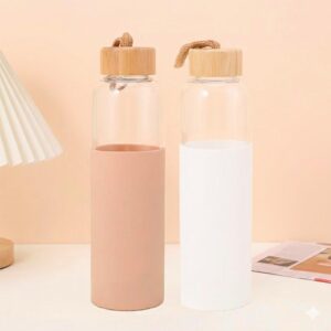 Tamano: 5,5 x 19,5 cm. Capacidad 440 ml. Vidrio. Cuerpo traslucido. Funda de neopreno para proteger la botella y mantener la temperatura de las bebidas. Tapa de acero inoxidable con tira de tela. Botella apta para microondas y lavavajillas. Tapa y funda no pueden ser expuestos a estos electrodomesticos. Presentacion en caja de regalo