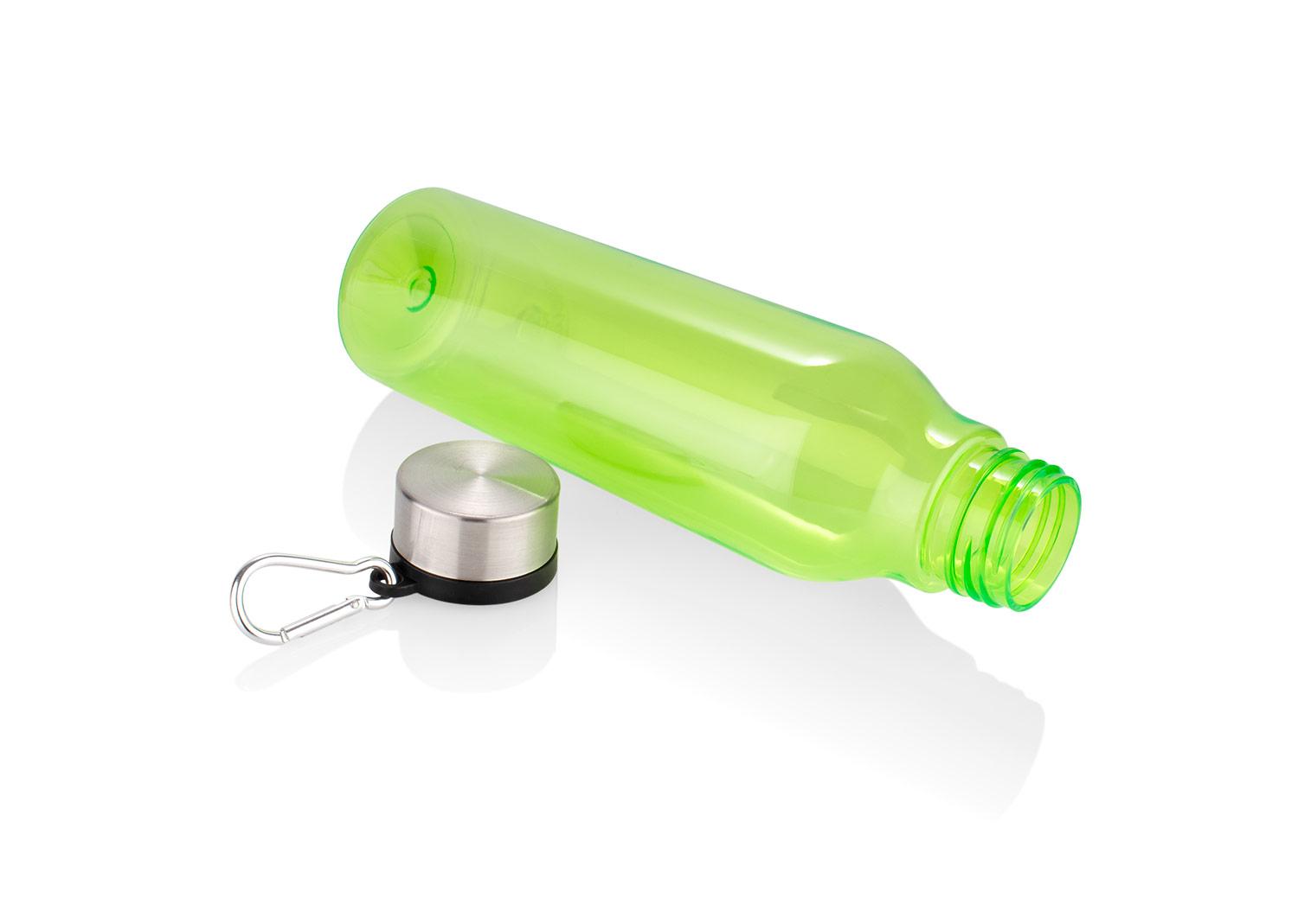Botella deportiva con diseno compacto; la hace ideal para llevar al gimnasio, la oficina o actividades al aire libre. Cuenta con tapa de cierre giratorio que garantiza un sellado seguro, y un gancho carabinero integrado que permite sujetarla facilmente a mochilas, bolsos o cinturones. Capacidad: 600 ml / 20 Oz || Material: RPET + Acero Inoxidable 201 + PP + Aluminio || Tamaño: Diámetro de 6 cm