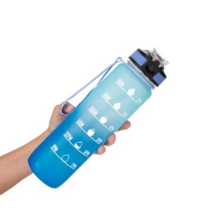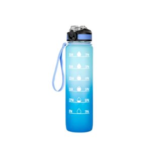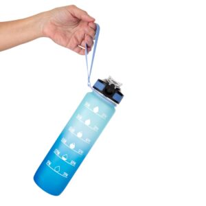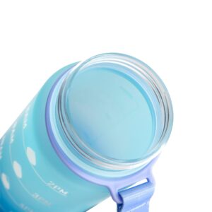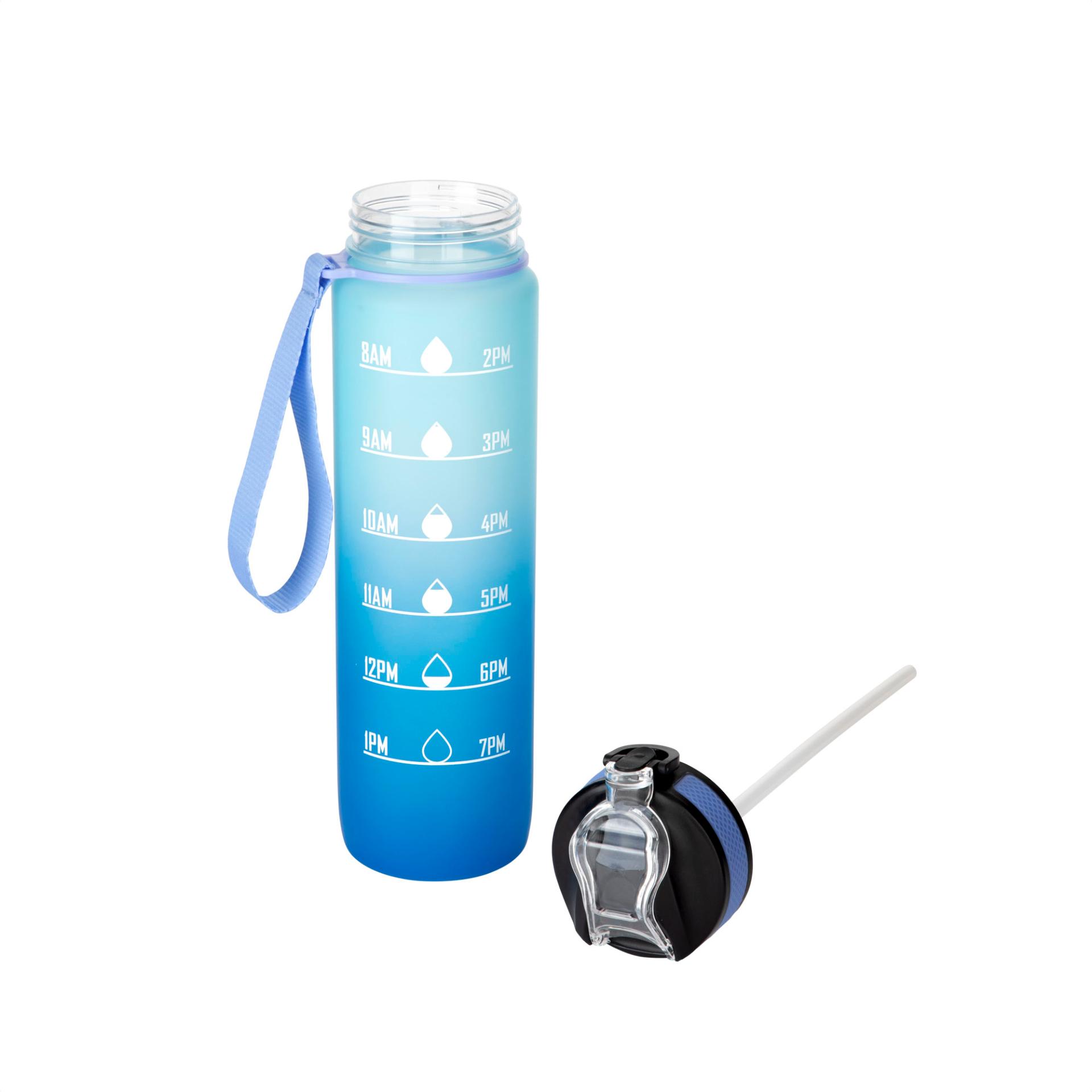 Motivacion que refresca y acompana.Botella con marcador de tiempo y medida. Colores pastel bitono en degrade con acabado frost. Tapa plastica combinada en color negro con un color de la botella. Apertura rapida, boquilla transparente rebatible y sorbete incluido. Correa del mismo color de la botella.Medidas: Ø 7 x 28cm. (con tapa) Capacidad: 1000 ml.Material: Plastico PETG, polipropileno, poliestireno y silicona.Presentacion: en caja de regalo kraft