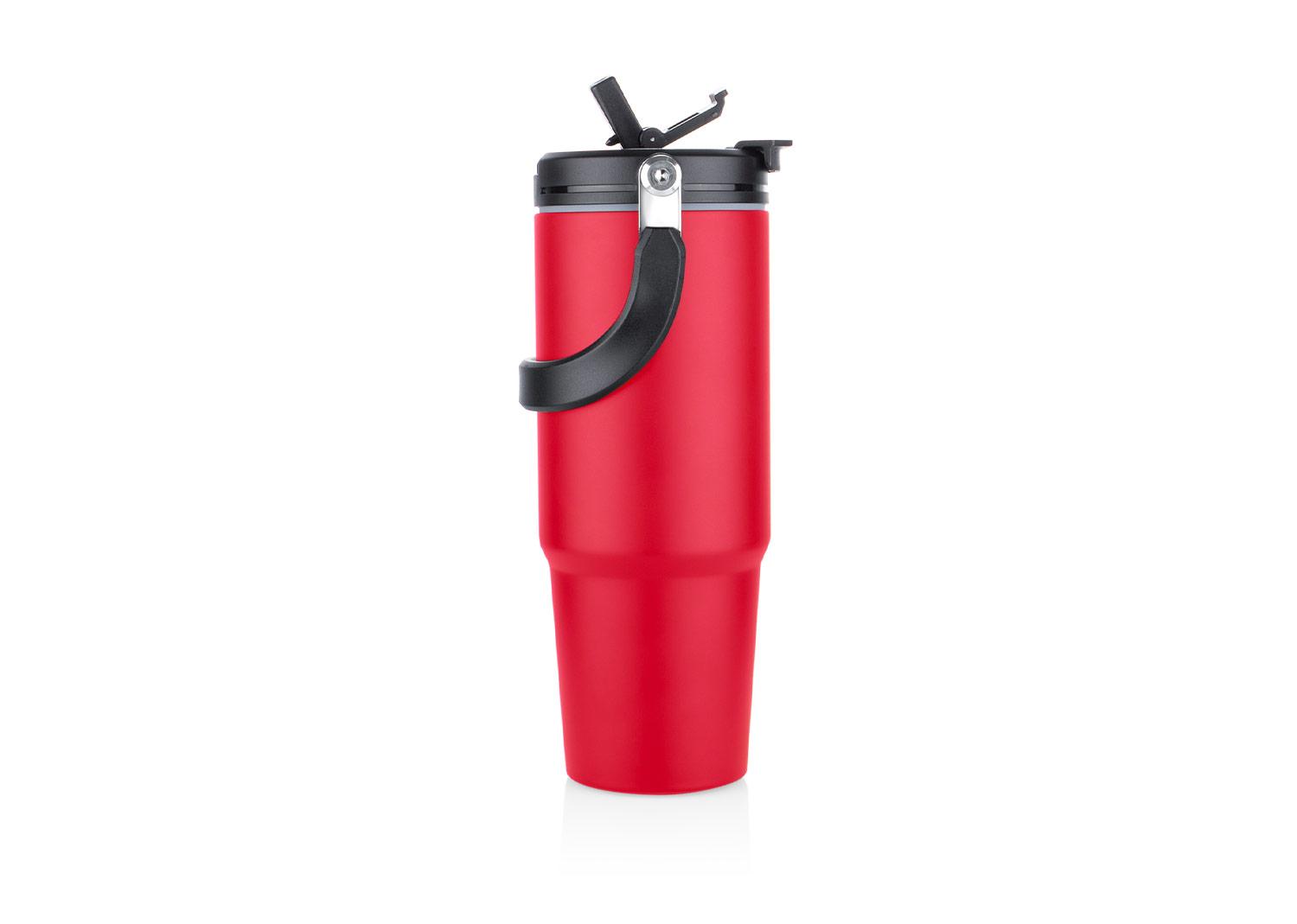Esta botella metalica es ideal para todo tipo de bebidas. Cuenta con una manija resistente, integrada en la tapa mediante una solida pieza de metal, que facilita su transporte y almacenamiento. Dispone de dos boquillas para el consumo de liquidos: una tipo boquilla y otra tipo pitillo, ambas con tapas de seguridad. Ademas, posee un borde de caucho que previene derrames. Mantiene las bebidas frias por 8 horas y las bebidas calientes por 4 horas. Capacidad 1000 ml / 34 Oz || Material: Acero 304, Acero 201, ABS, PP || Tamaño: Diámetro de 6 cm