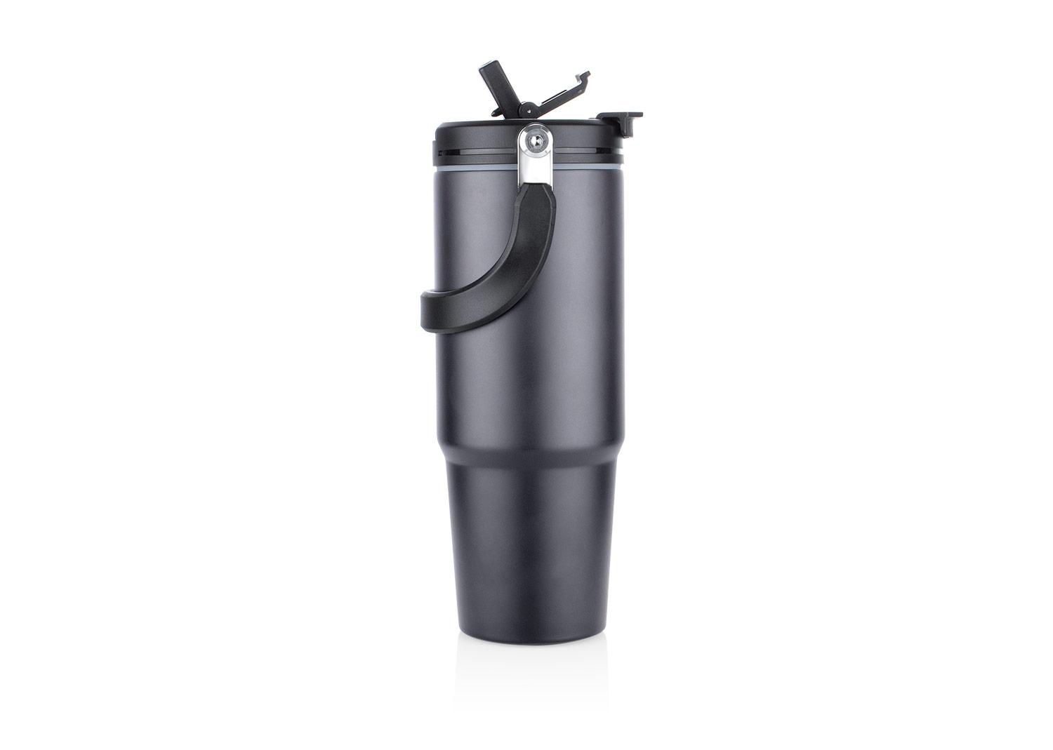 Esta botella metalica es ideal para todo tipo de bebidas. Cuenta con una manija resistente, integrada en la tapa mediante una solida pieza de metal, que facilita su transporte y almacenamiento. Dispone de dos boquillas para el consumo de liquidos: una tipo boquilla y otra tipo pitillo, ambas con tapas de seguridad. Ademas, posee un borde de caucho que previene derrames. Capacidad 1000 ml / 32 Oz || Material: Acero 304, Acero 201, ABS, PP || Tamaño: Diámetro de 6 cm