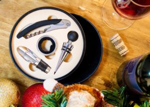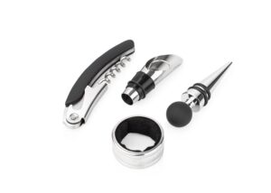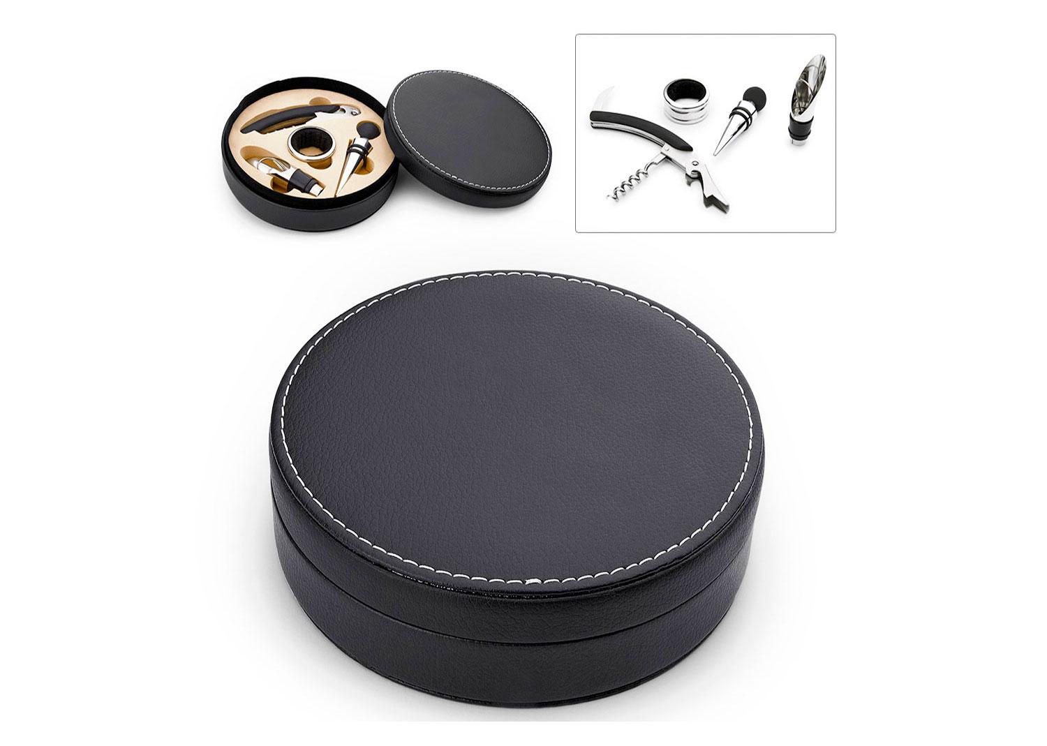 Contiene 4 accesorios de bar: Tapon para botella, cortagotas, aro antigoteo, sacacorchos de 1 tiempo. Caja interior beige || Material: PU || Tamaño: Diámetro de 14.5 cm