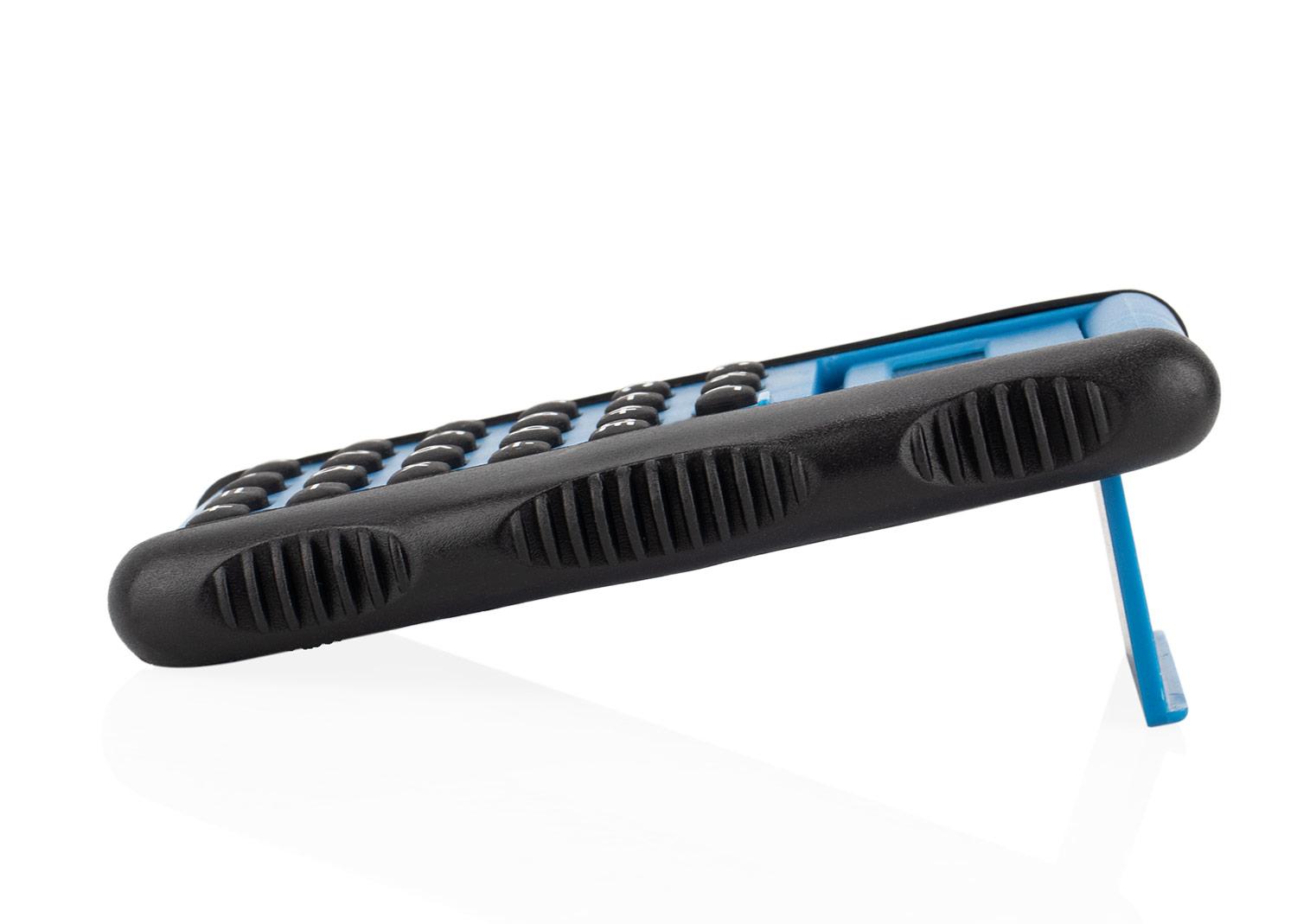 Calculadora de escritorio con diseno funcional. Cuenta con una palanca que, al bajarla, destapa el visor y convierte la tapa en una base de apoyo. Incluye funciones estandar como operaciones basicas, porcentaje, raiz cuadrada, memoria y correccion. Su estructura con agarres laterales texturizados facilita su manipulacion || Material: Plástico || Tamaño: 7 x 9.6 x 1 cm