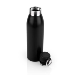 Cilindro metalico de una pared. Incluye tapa de plastico con sistema de rosca para un cierre hermetico. Adicional, su misma tapa incluye una segunda rosca que incorporar un filtro para preparar te o infusiones. El asa en la tapa permite transportarlo con mayor comodidad. Capacidad de 22 Oz. Incluye caja individual || Material: Acero inoxidable / Plástico || Tamaño: 9 x 19.3 x 7.5 cm
