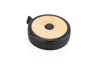 Esta cinta metrica retractil cuenta con una longitud de 150 cm y 60 pulgadas. La medida se mantiene fija en la posicion deseada, y al presionar el boton, la cinta se retrae rapidamente. Su diseno compacto y funcional la hace ideal para mediciones rapidas y precisas en distintos entornos || Material: Bambú || Tamaño: Diámetro de 3.8 cm