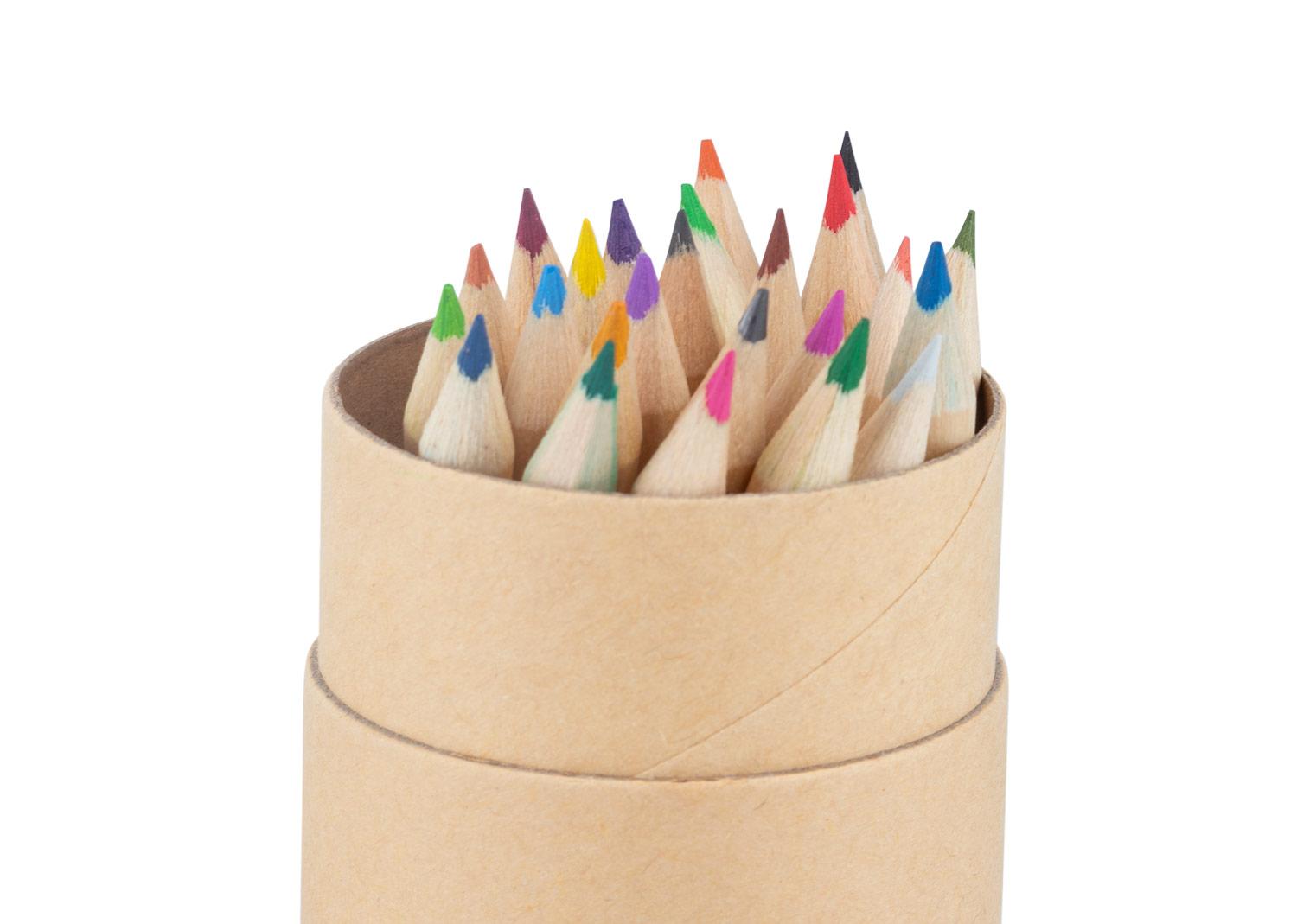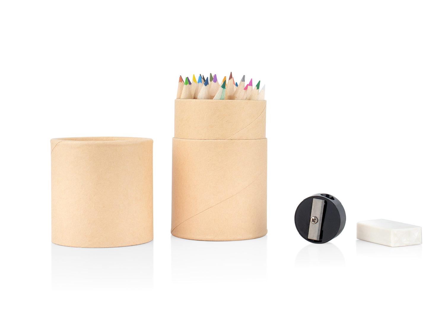 Este juego incluye 24 lapices de colores (8,7 X Ø 0,3) presentados en una caja de carton, que ademas incorpora un sacapuntas (1,1 X Ø 2) y una goma de borrar (3,6 X 1,9 X 1,3) en su interior. Es una solucion practica y completa para actividades creativas, ideal para mantener todo lo necesario en un solo empaque || Material: Madera + Papel kraft || Tamaño: Diámetro de 4.1 cm