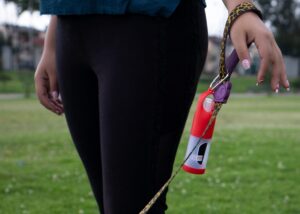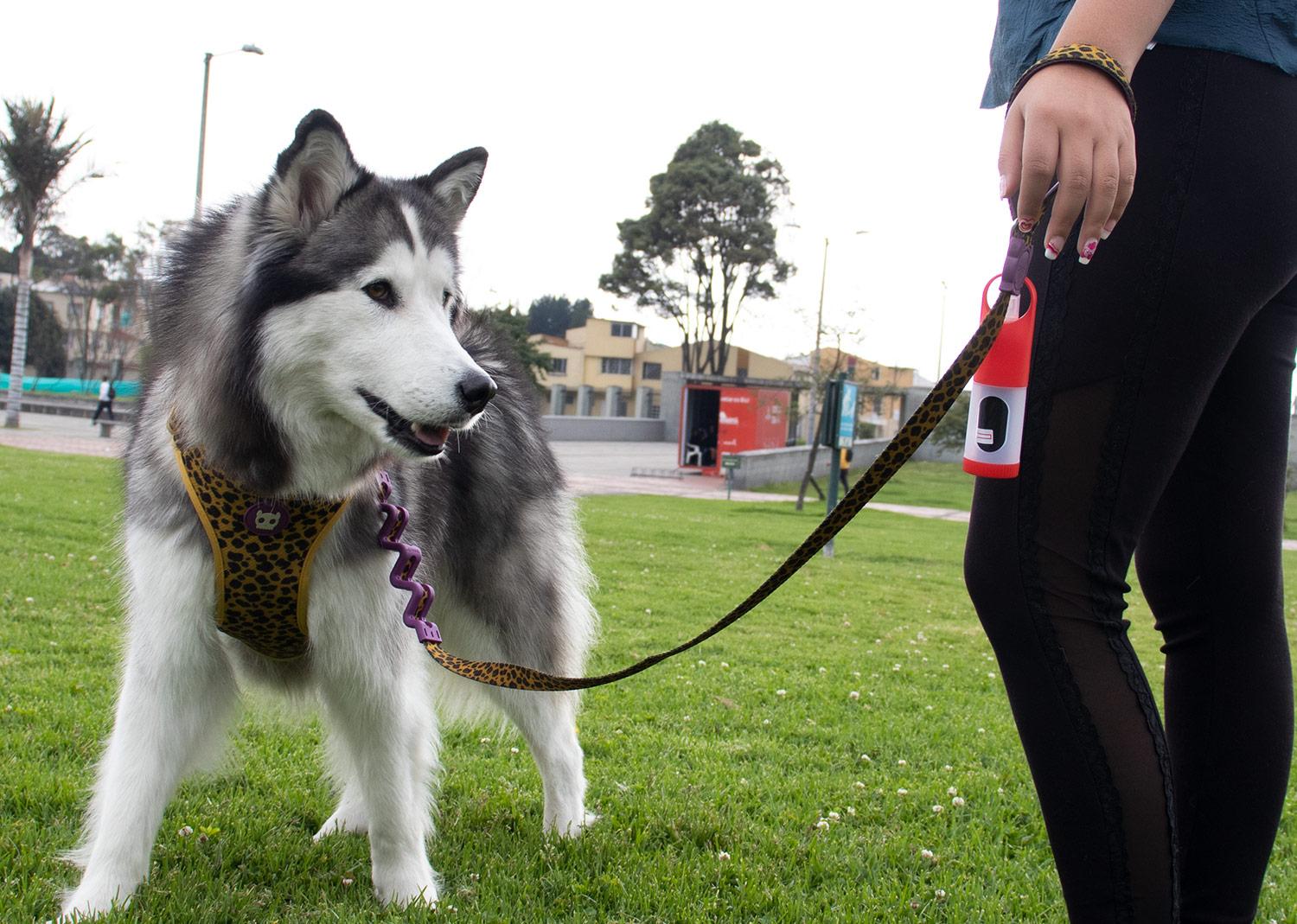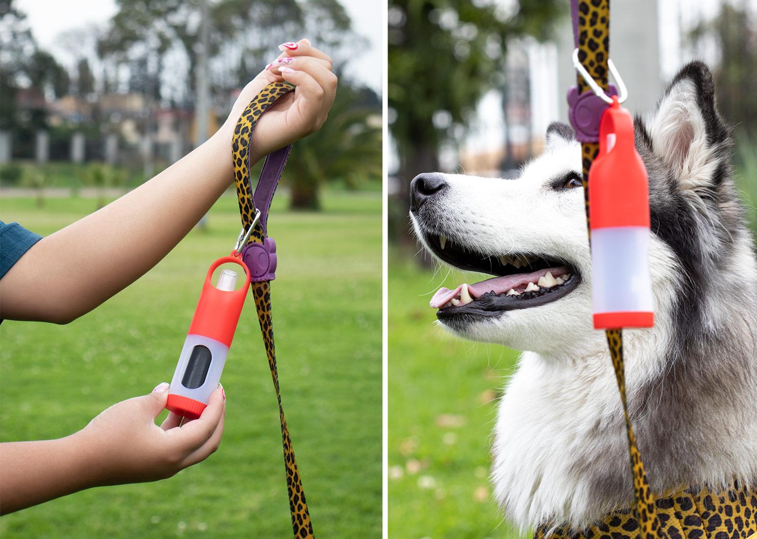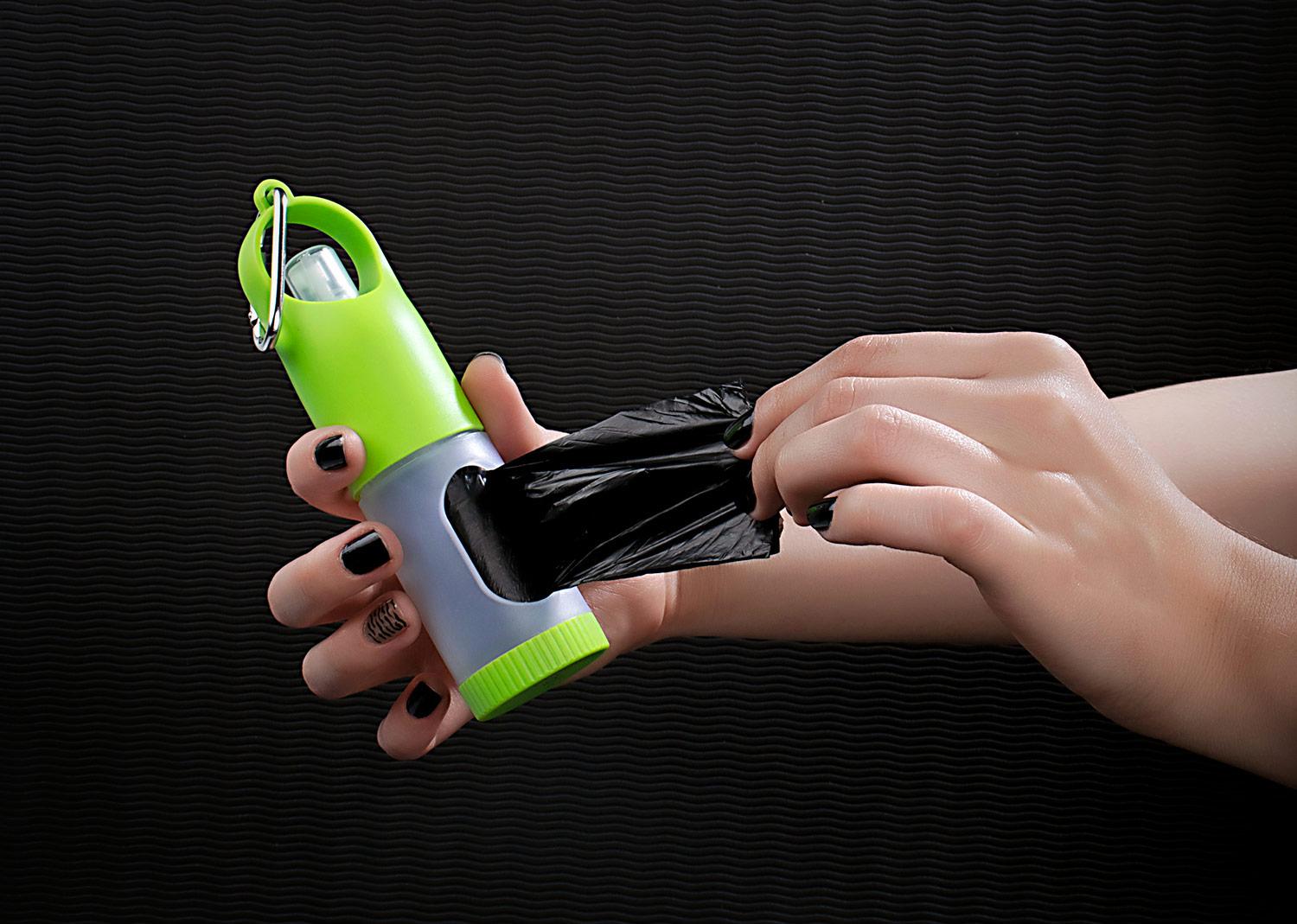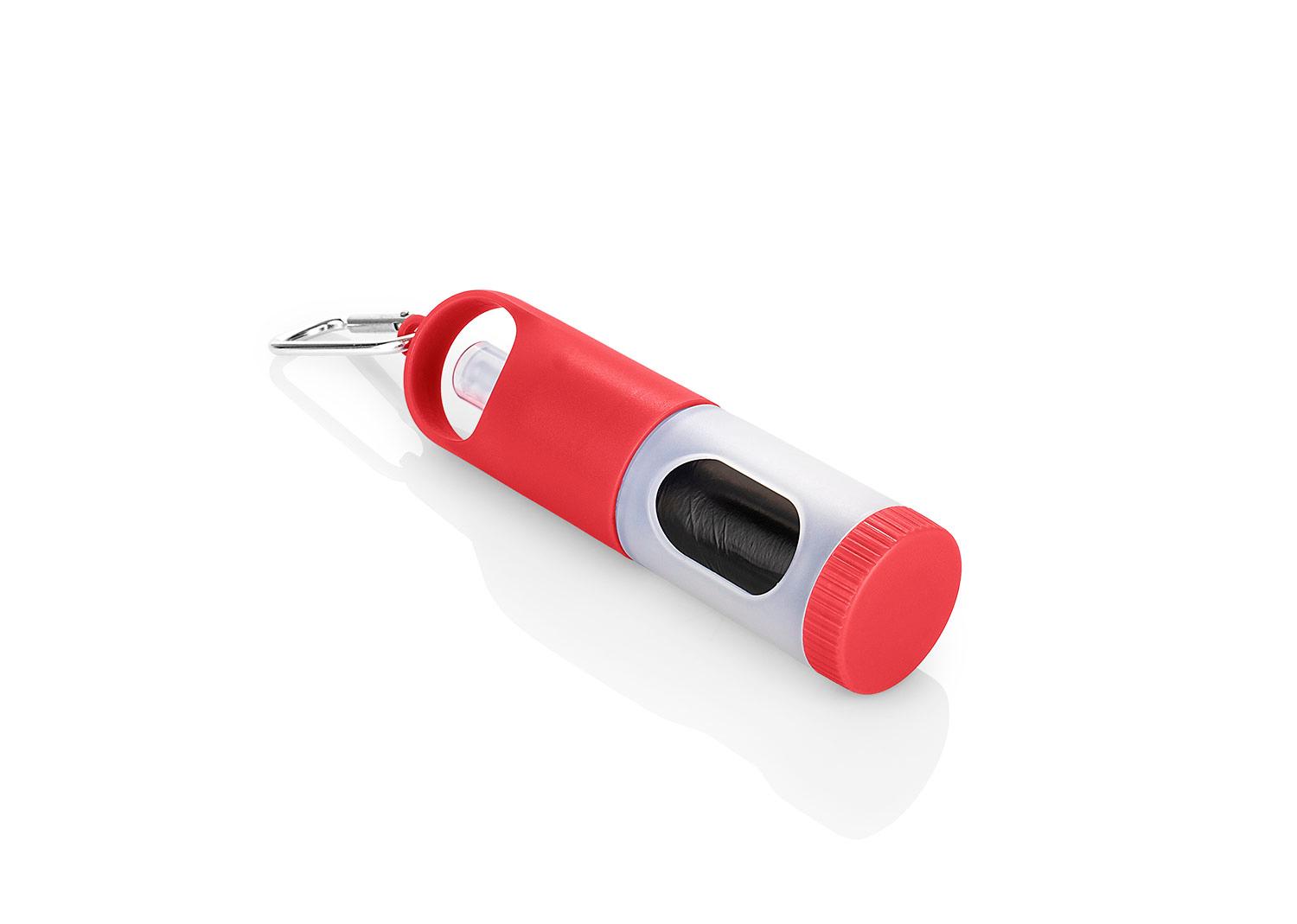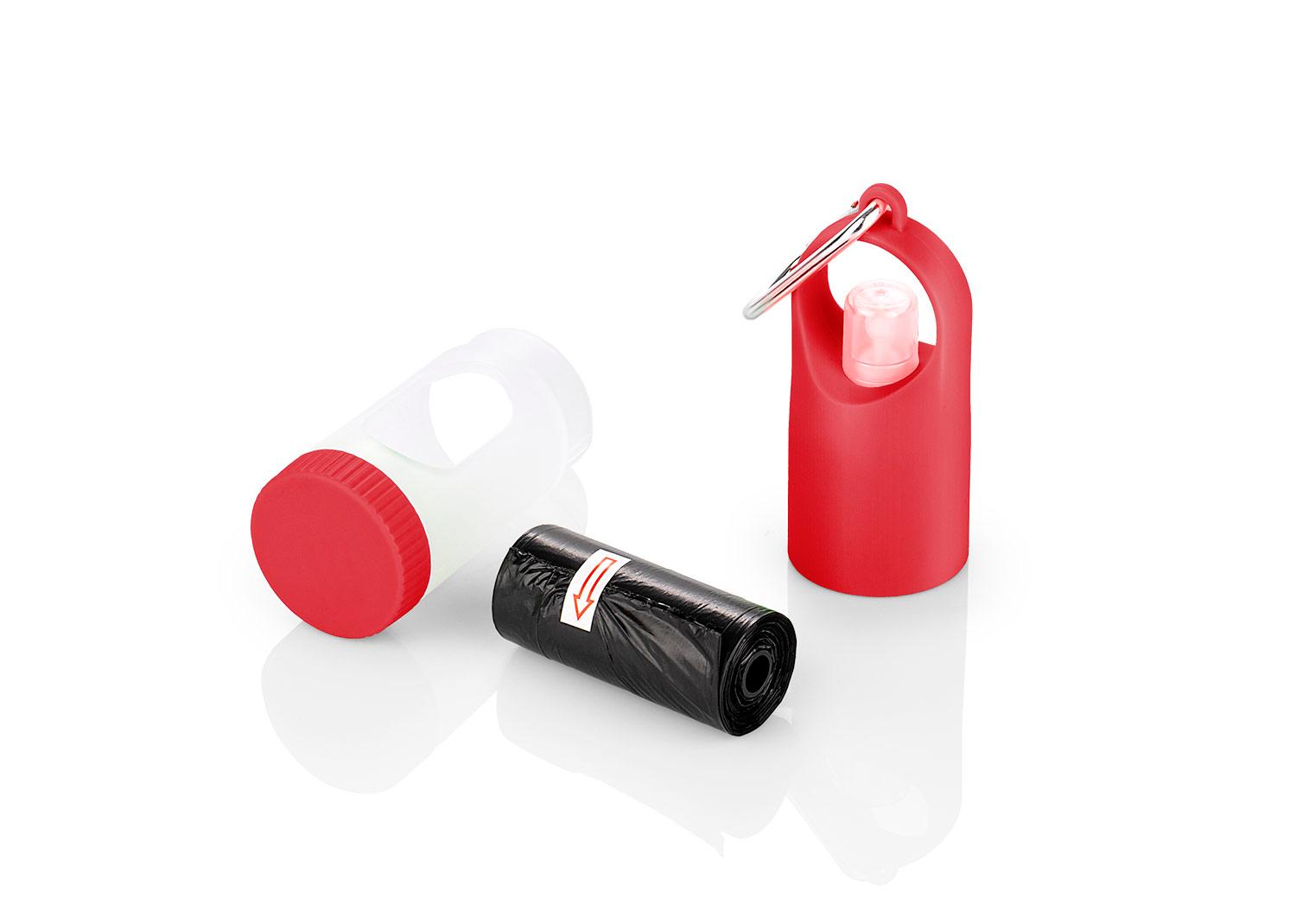 Dispensador de bolsas para mascota. Con gancho carabinero y 15 bolsas incluidas. Frasco para recargar liquidos como gel o alcohol (no incluidos) || Material: ABS+PP. Bolsas PE. Carabinero aleación de Aluminio || Tamaño: Diámetro de 3.80 cm