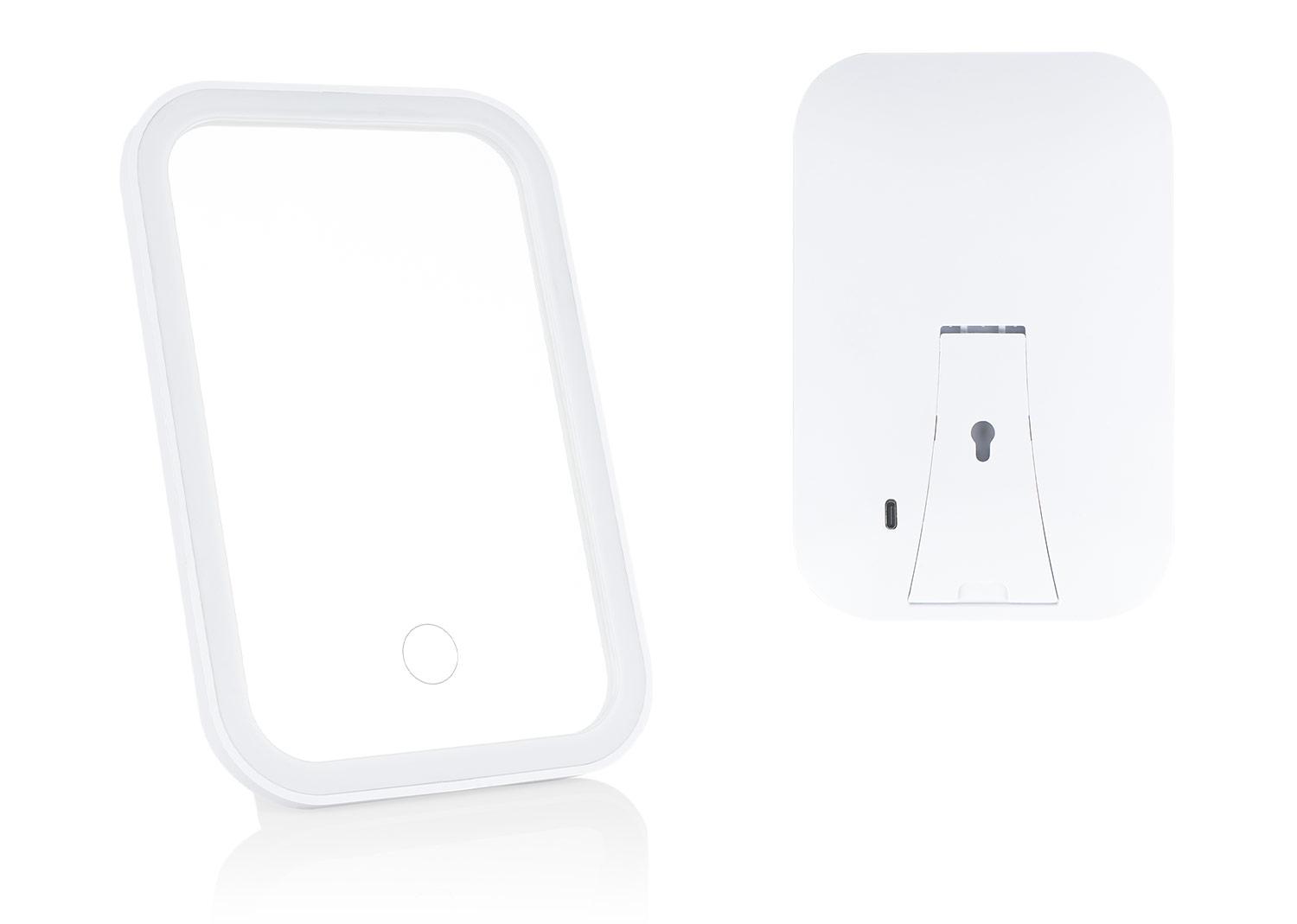 Espejo para tocador o para viaje con luz led incluida. Soporte para mesa y orificio que permite colgarlo. Permite ajustar el brillo segun la necesidad || Material: ABS || Tamaño: Diámetro de 0 cm