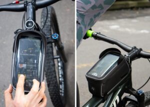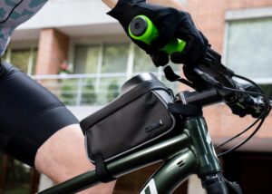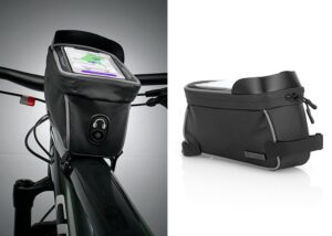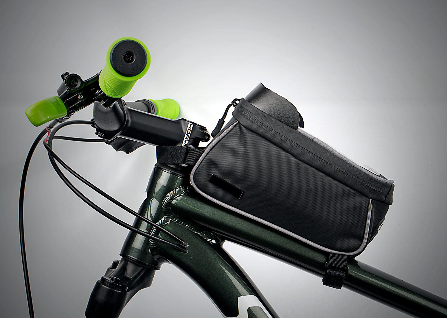 Estuche impermeable para bicicleta, bolsilo transparente para ubicar el celular de 5,8in, (permite manipular el celular sin que se moje). Doble cremallera, orificio ideal para audifonos, Incluye placa metalica para marca laser || Material: TPU con cuero PVC || Tamaño: 9.00 x 10.00 x 18.50 cm