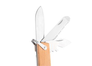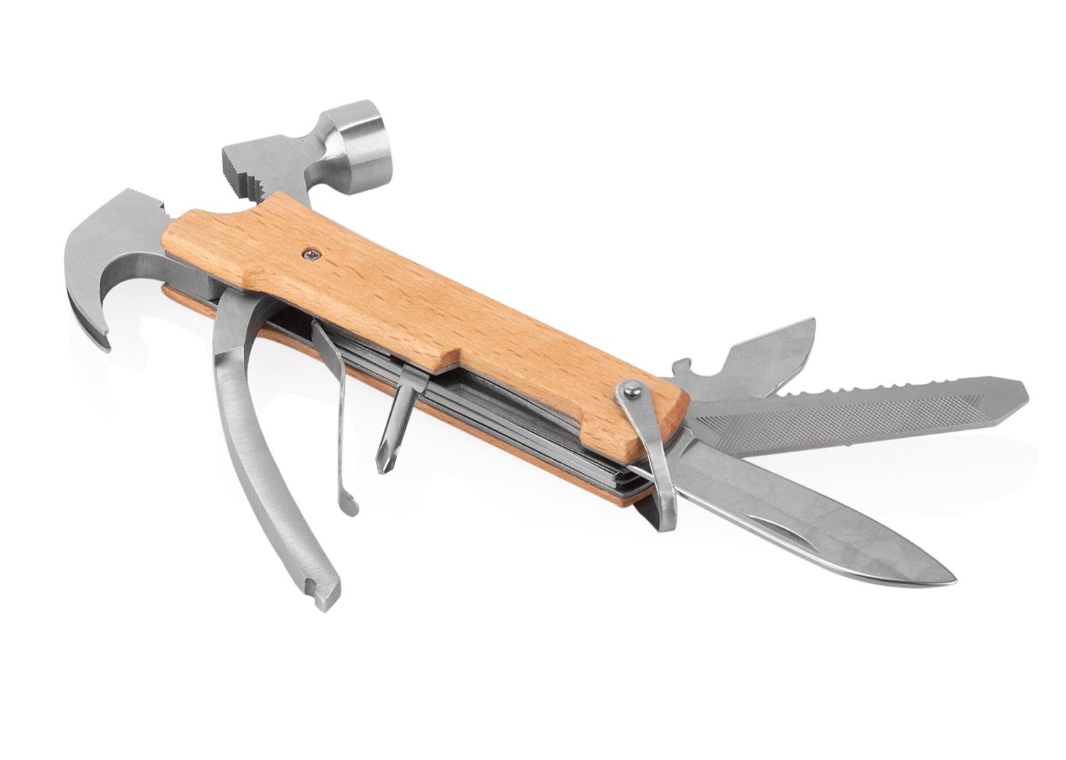 Esta herramienta multifuncion cuenta con un diseno compacto y mango de madera, e integra funciones esenciales como martillo, apilador, extractor de clavos (7,2 X 13,8), dos destornilladores (pala y estrella), cuchillo (1,7 X 18,1), abrebotellas (2 X 16,2) y una lima de unas con cuchillo de sierra (1,7 X 18,7). Su formato plegable permite un facil almacenamiento y transporte, ideal para tareas basicas en distintos entornos || Material: 2cr13 + Madera de haya || Tamaño: 6.7 x 15.7 x 0.5 cm