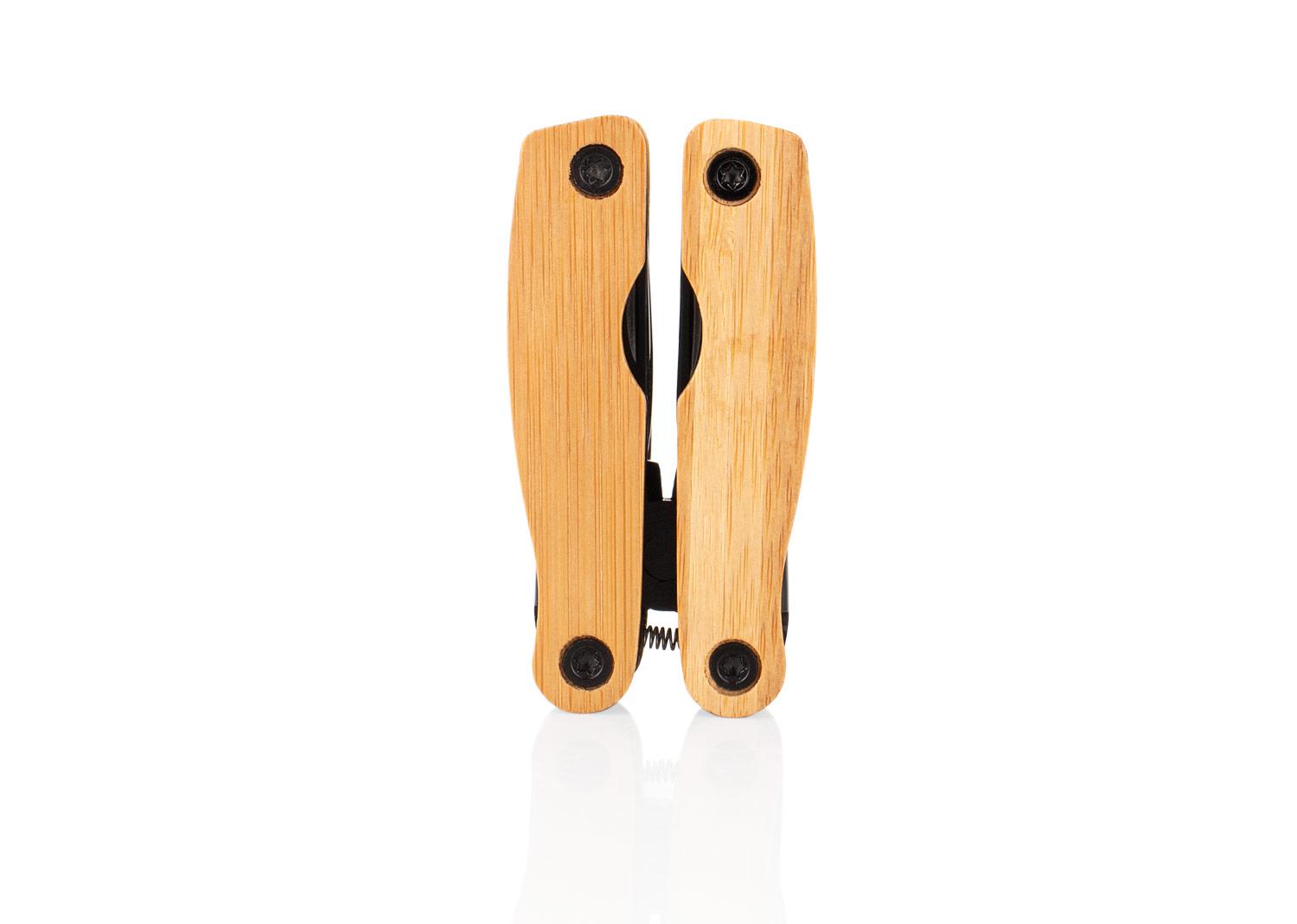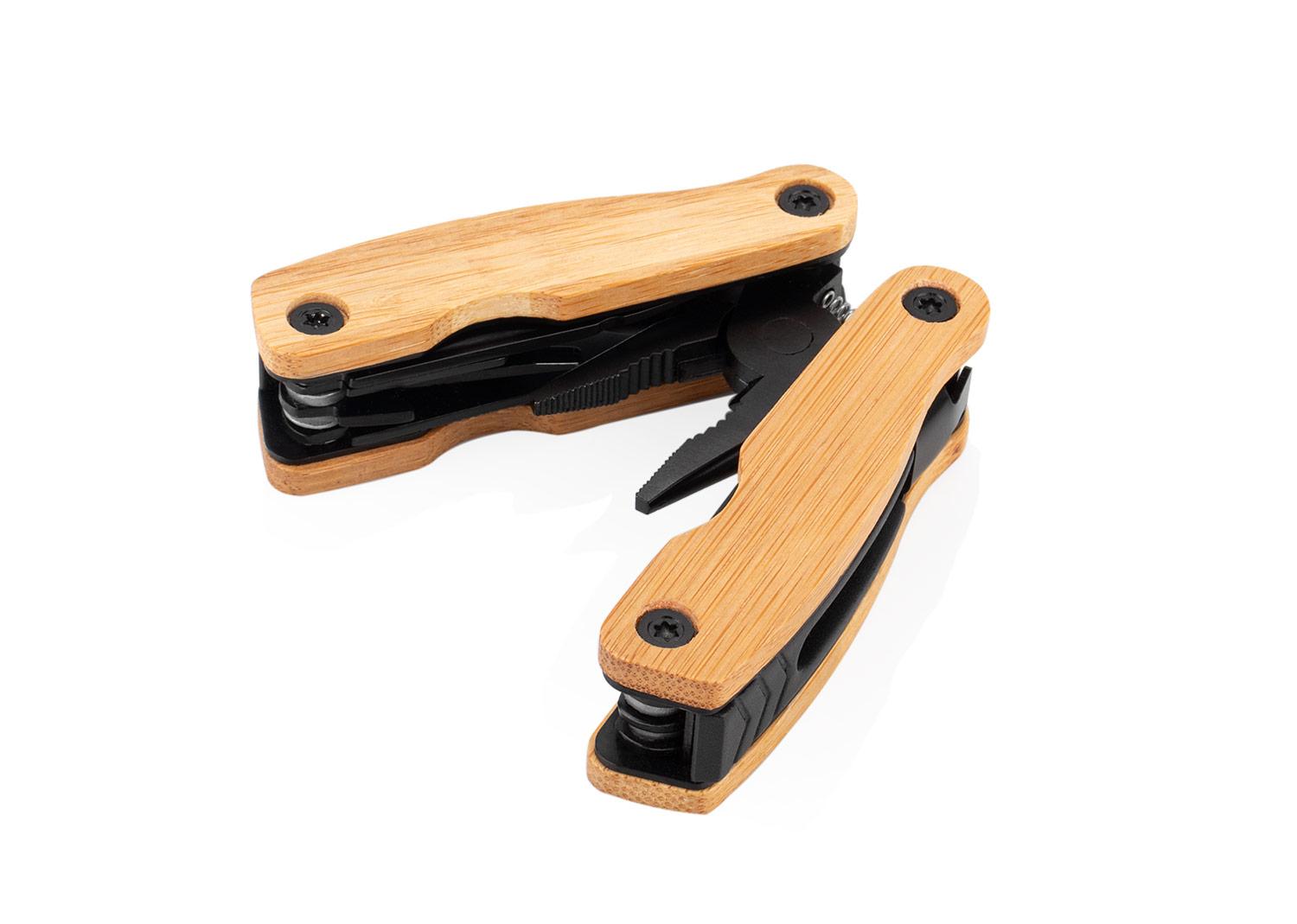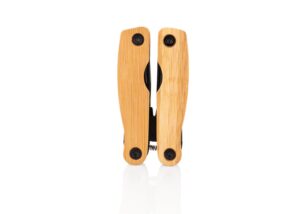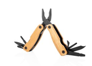 Esta herramienta multifuncion cuenta con un diseno plegable y mango de madera, e integra alicates de punta fina y alicate regular (5,2 X 10,1), destornillador estrella (0,4 X 2,6) y pala (0,8 X 4), lima de unas (0,8 X 3,6), abrelatas con removedor de ganchos, cuchillo (0,8 X 3,5), abrebotellas y sierra (0,6 X 3,6). Su formato compacto permite llevarla facilmente y tener a la mano las funciones basicas para tareas cotidianas || Material: Bambú + 2cr13 || Tamaño: 7 x 3.6 x 2.1 cm