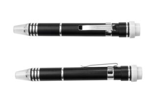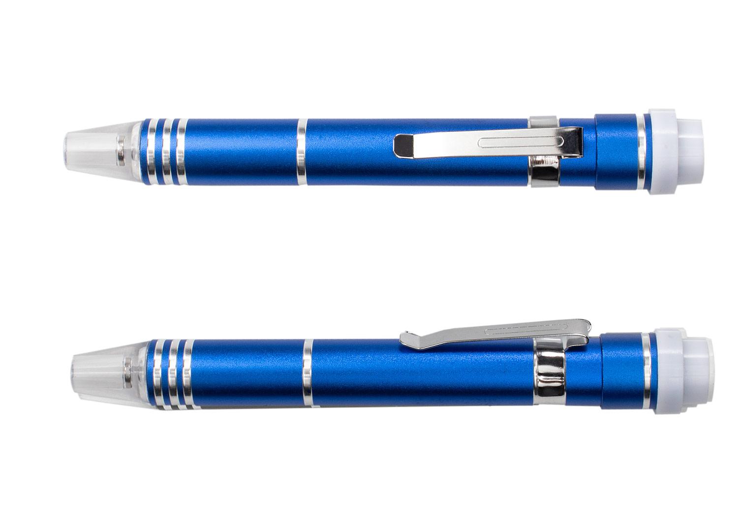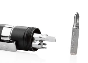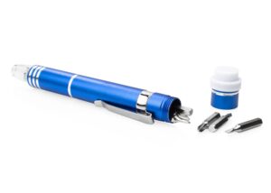 Practico y versatil herramientero con clip, ideal para llevar siempre a mano. Cuenta con una tapa de presion que asegura el boton de encendido de la linterna integrada, brindando funcionalidad adicional en cualquier situacion. En la parte superior incorpora un cierre giratorio que almacena 6 puntas de destornillador intercambiables, las cuales se insertan facilmente en la punta del herramientero para realizar reparaciones rapidas y precisas. Su diseno compacto y metalico lo convierte en una herramienta indispensable para el dia a dia || Material: Acero, Aluminio || Tamaño: Diámetro de 1.6 cm