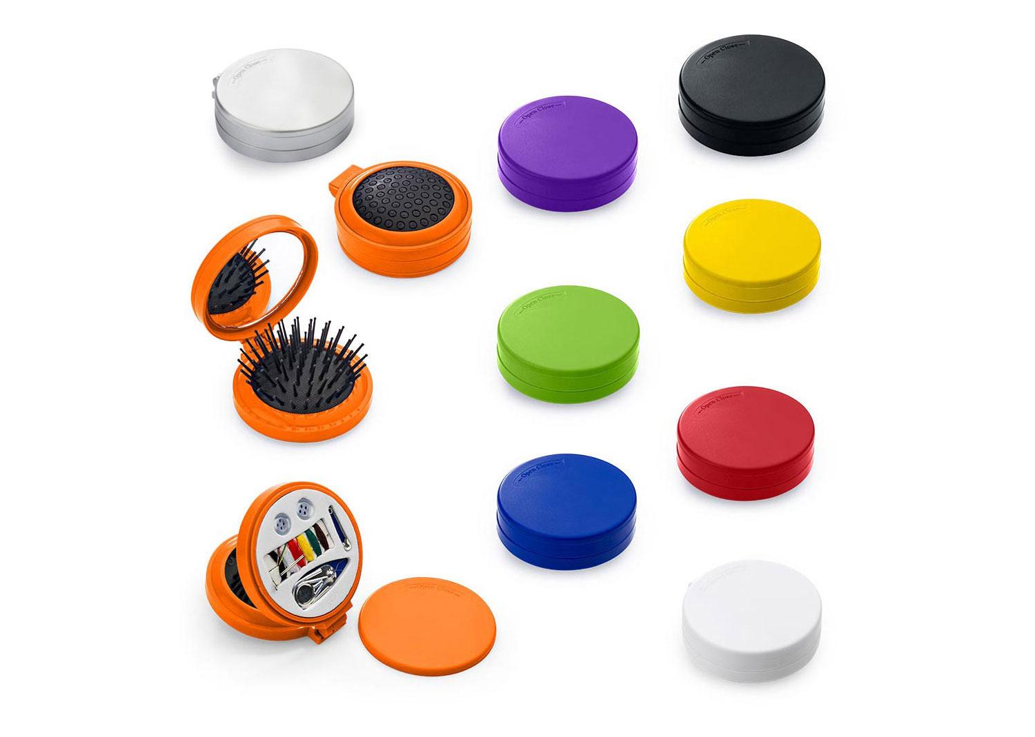 Espejo con cepillo redondo para cabello. Incluye un costurero con 6 hilos de colores, 2 agujas, gancho nodriza, enhebrador y 2 botones || Material: ABS || Tamaño: Diámetro de 6.50 cm