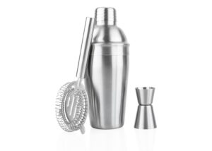 Kit esencial para amantes de la mixologia, elaborado en acero inoxidable con acabado brillante. Incluye: 1 coctelera de 550 ml, 1 medidor doble (jigger) de 15 ml y 30 ml (6,7 X Ø 3,8) y 1 colador tipo espiral (9,2 X 19,2 X 1,8). Disenado para preparar cocteles con precision y estilo, este set combina funcionalidad y elegancia, ideal para uso profesional o en casa || Material: Acero Inoxidable || Tamaño: Diámetro de 8.4 cm