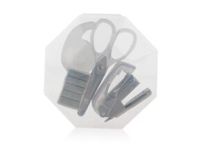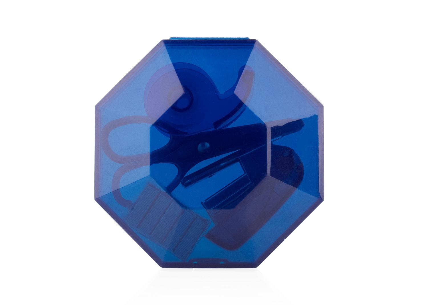 Practico set de oficina con diseno octogonal y cierre a presion, ideal para mantener organizados los elementos esenciales de escritorio. El estuche incluye ganchos para cosedora, una cosedora (4 X 2,8 X 1,7), tijeras (3,4 X 7,2 X 0,6) y cinta adhesiva transparente con dispensador (3,7 X 2,3 X 1,4) || Material: ABS || Tamaño: 8 x 8 x 2.2 cm
