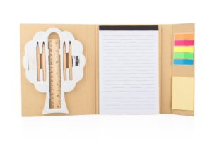 Practica libreta con accesorios integrados, ideal para uso escolar o de oficina. Incluye: 4 colores (8,8 X Ø 0,5), 1 regla (15 cm) y (6in), 1 sacapuntas, borrador, 50 hojas de papel de 70 g/m2 (13,6 X 20,4), 25 hojas de notas adhesivas (5 X 7,5) y separadores adhesivos en 5 colores. Cierre con caucho para mantener el contenido seguro. Diseno compacto y funcional para mantener todo lo esencial en un solo lugar || Material: Papel de 70 gr || Tamaño: 15 x 21 x 2.3 cm