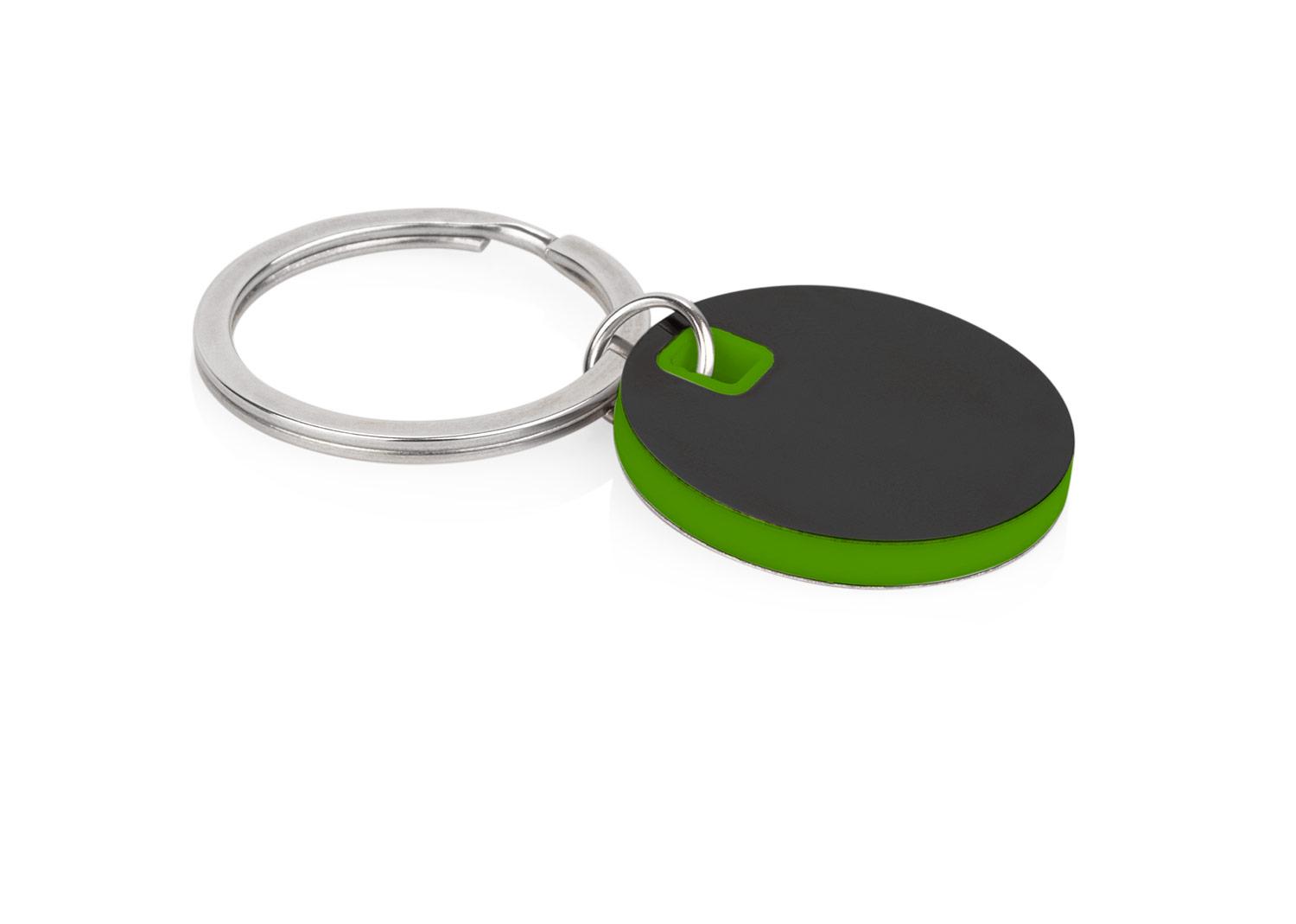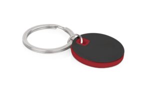Llavero metalico con forma redonda. Diseno elegante de acabado bicolor, con detalles en plastico de alto contraste. Incluye anillo metalico resistente || Material: Acero, Acrílico || Tamaño: Diámetro de 2.5 cm