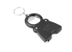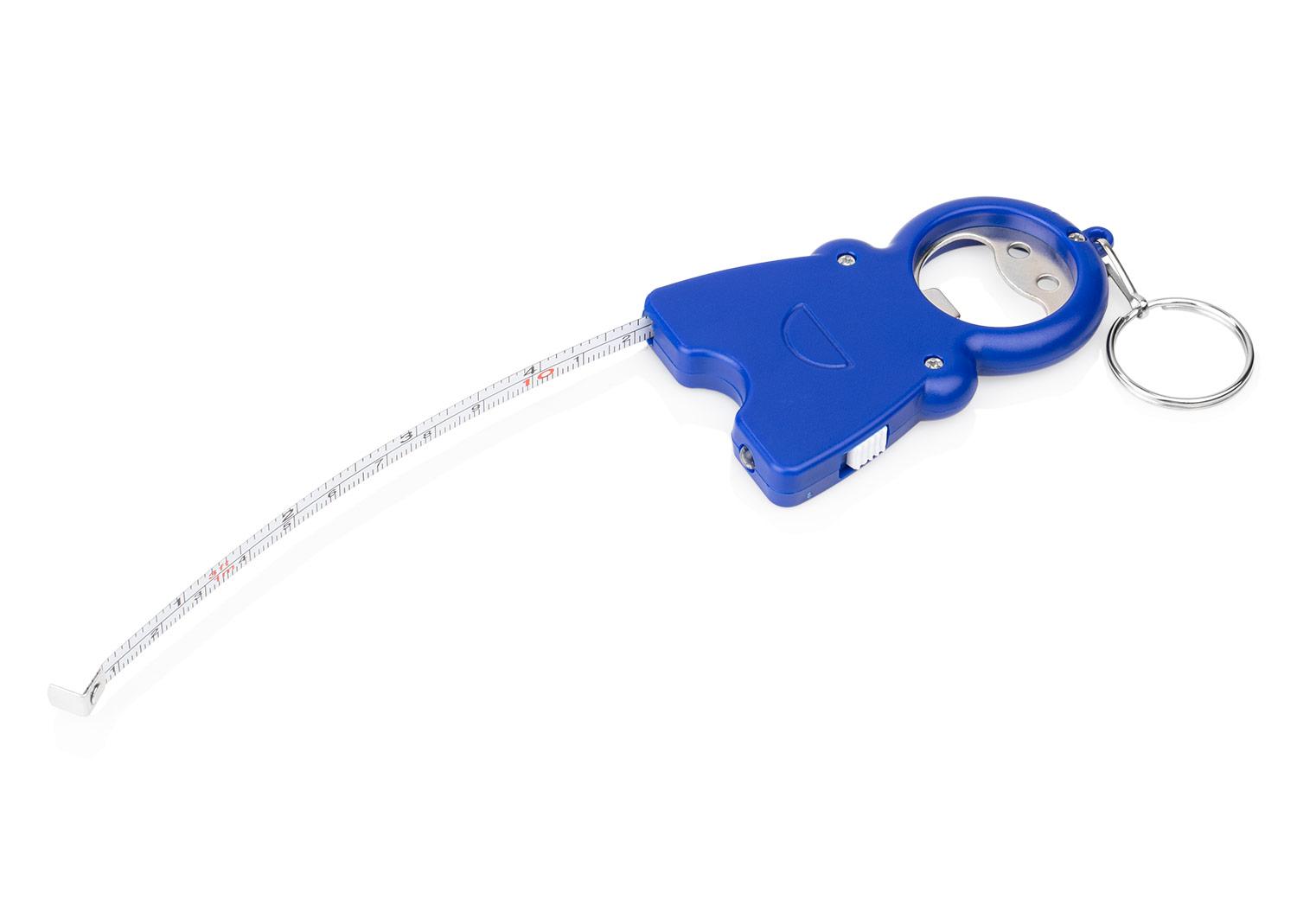 Llavero multifuncional con diseno compacto y divertido, ideal para el dia a dia. Incluye abrebotellas integrado en la parte superior, linterna LED que se enciende y apaga facilmente mediante una palanca lateral, y cinta metrica de acero retractil con doble escala de hasta 100 cm y 39 pulgadas. Su estructura resistente y su anillo metalica lo hacen practico para llevar siempre contigo || Material: ABS + Acero || Tamaño: 5.2 x 8.3 x 1 cm