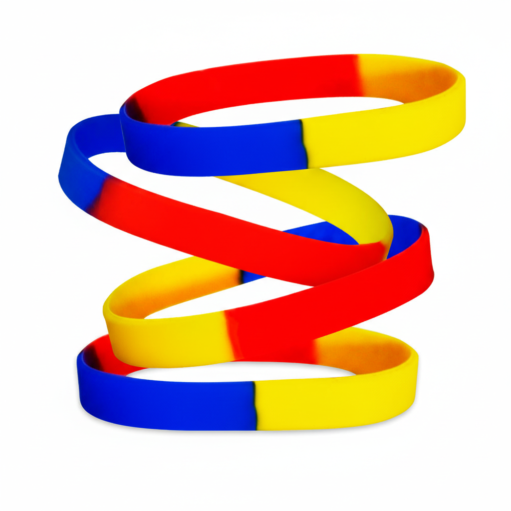 Siliconadas con la bandera de Colombia. De: de 1,2 x 6,5 cm de diametro. – Impresion: Tampografia silicona. Tamano Area Impresa: 2.5 x 0,8 cm. – Caja: 42x40x36 cm. 2000 unidades 13 KG