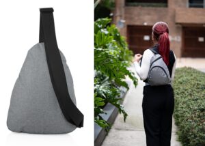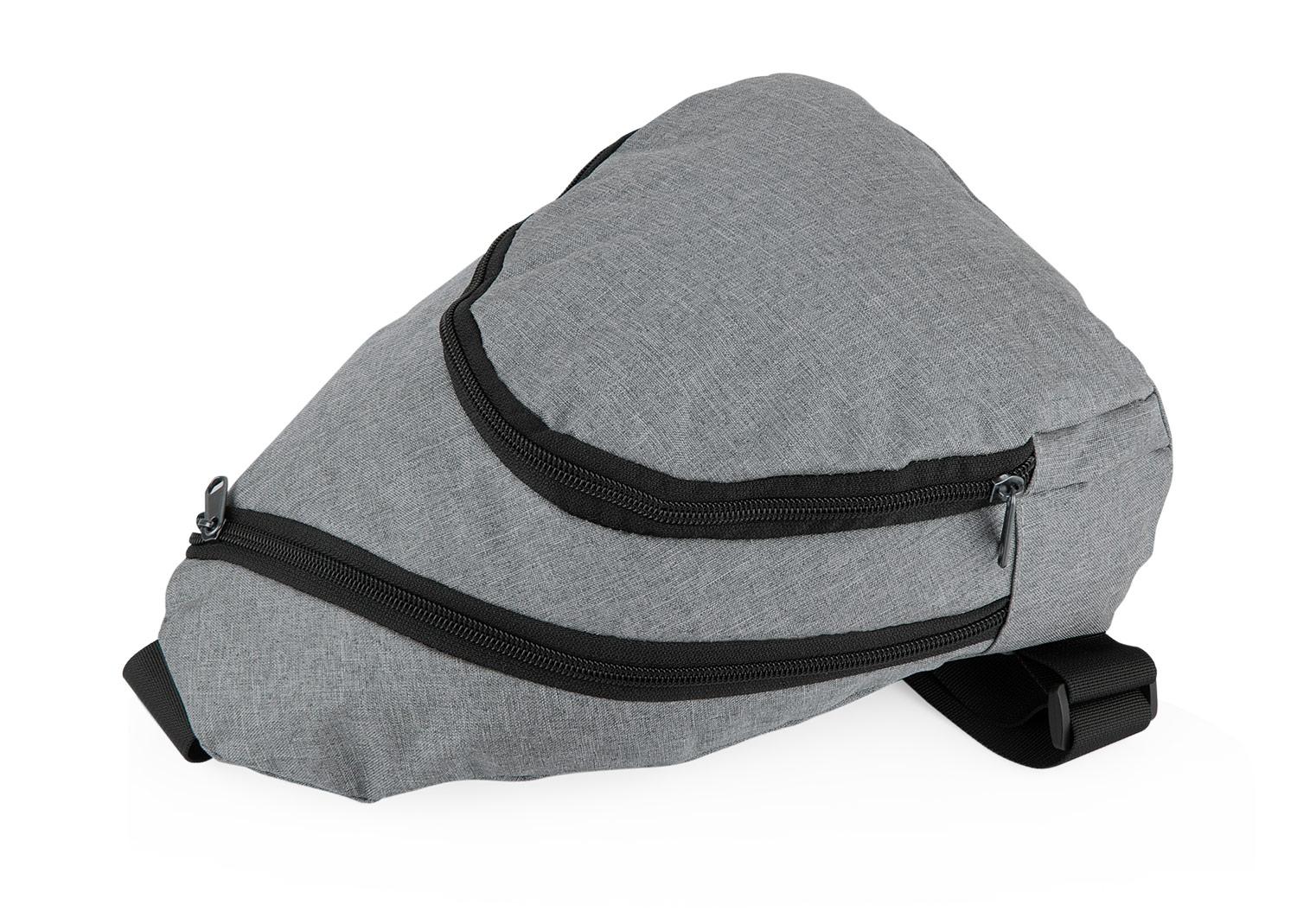 Bolso tipo sling con diseno compacto y funcional. Cuenta con bolsillo frontal con cremallera y correa ajustable para mayor comodidad. Ideal para llevar objetos personales de forma practica en actividades al aire libre o en la rutina diaria || Material: Poliéster 300D, 210D + RPET || Tamaño: 25 x 32.5 x 7 cm