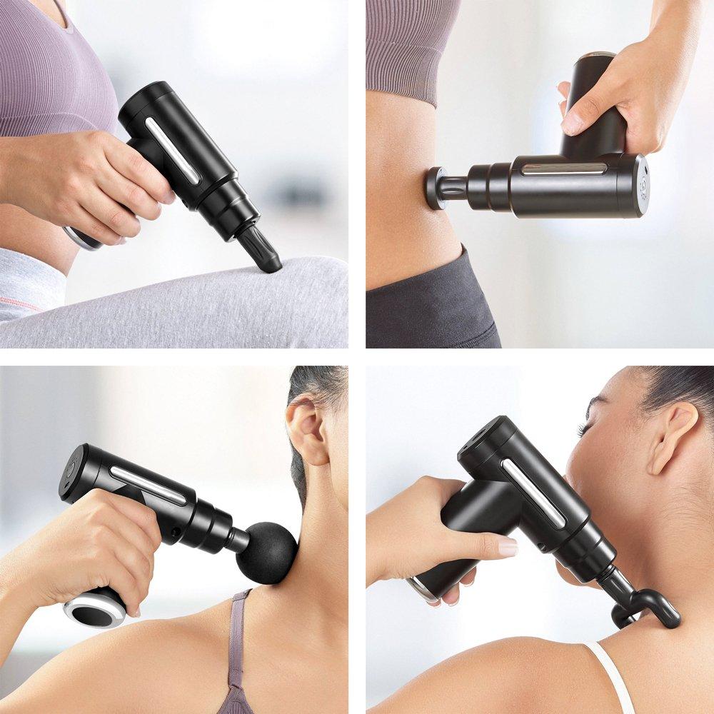 Pistola para masajes de tejido muscular y mini fascial con 6 niveles de velocidad y frecuencia variable. Incluye 4 cabezales intercambiables para diferentes partes del cuerpo. Duracion bateria 1-2 horas. Cable de carga tipo C. Velocidades variables entre 1800-3200 rpm. De 19.8 x 6.6 cm. Caja individual. – Impresion: Tampografia Tamano Area Impresa: 6 x 4 cm. – Caja: 62 x 31 x 32 cm. 40 unidades 22 KG