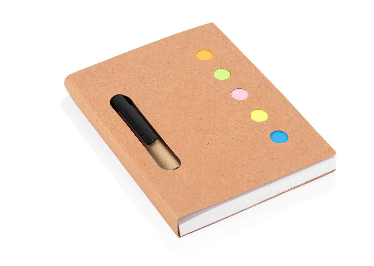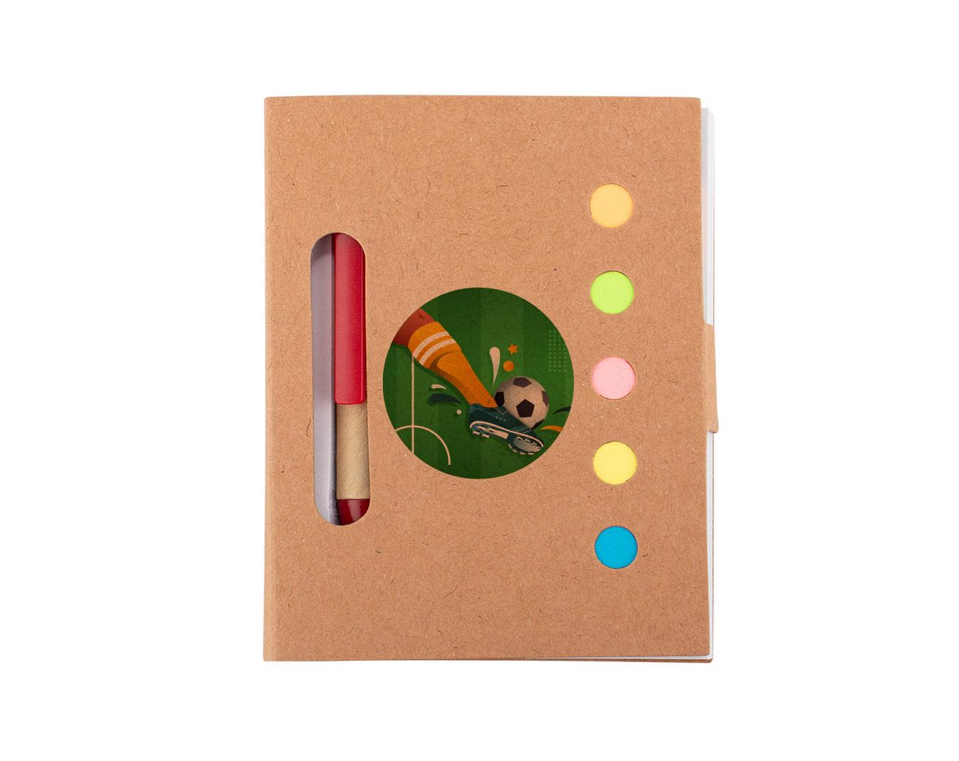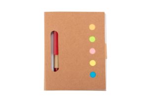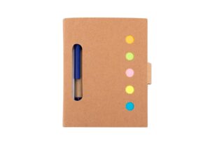 Organiza tus ideas con estilo y funcionalidad. Este practico set incluye portada y contraportada elaboradas en papel artesanal, que aportan un toque ecologico y elegante. En su interior encontraras 5 colores de notas adhesivas (25 hojas c/u) para destacar lo importante, junto a 80 hojas de 70 g/m2, faciles de desprender para tus apuntes diarios. Ademas, incorpora un boligrafo (8,5 X Ø 0,8 X 1,1) con barril de papel, clip y mecanismo retractil, ideal para escribir comodamente en cualquier momento. ¡Un aliado perfecto para tu escritorio o para llevar contigo a todas partes || Material: Papel Kraft + Papel 70 gr || Tamaño: 8 x 10.4 x 1.1 cm
