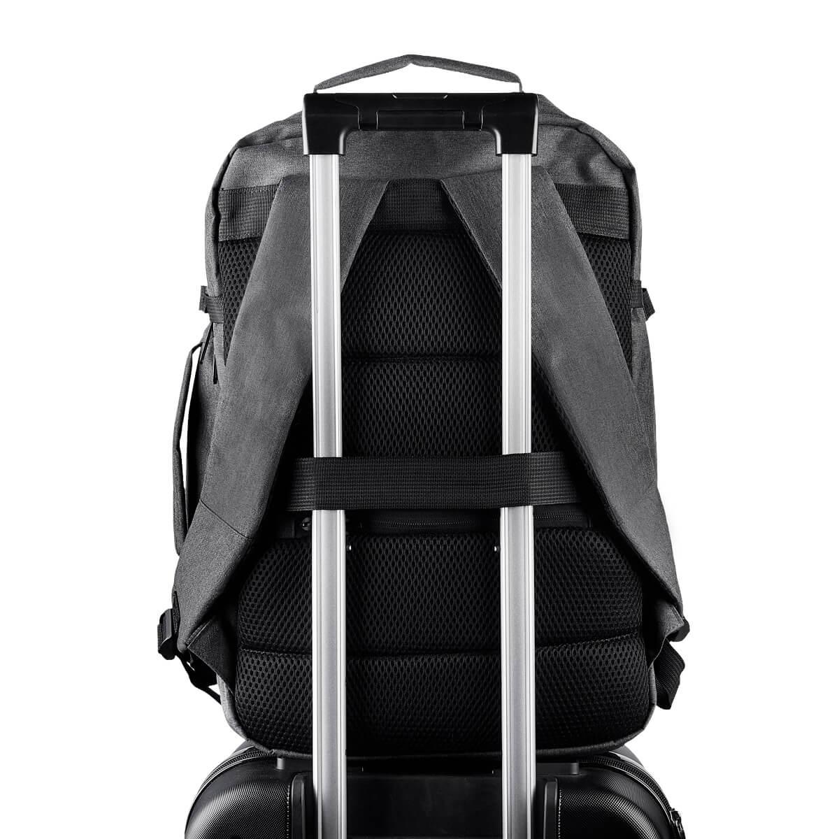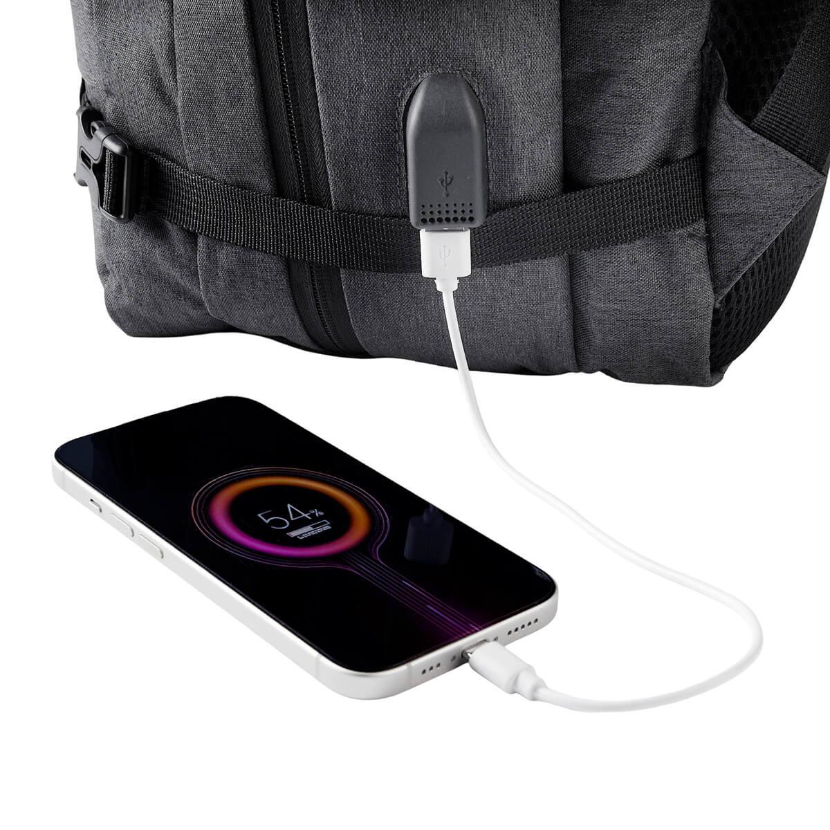 Mochila de viaje, disenada para ofrecer maxima funcionalidad. Su compartimento principal de apertura total, permite un acceso al interior mas comodo y mas organizado, ideal para viajes cortos. Cuenta con compartimento acolchado para laptop de hasta 16 pulgadas. Bolsillo frontal con cierre y organizador interno para guardar objetos personales. Adicional, tiene un bolsillo de seguridad en la parte trasera. Sus asas acolchadas garantizan su confort y comodidad, mientras que su practica salida USB, facilita la carga de tus dispositivos moviles incluso en movimiento. Cuenta con una banda trasera idonea para acoplarla al trolley y transportar con mayor facilidad || Material: Poliéster / Forro Poliéster || Tamaño: 33 x 49 x 21.5 cm