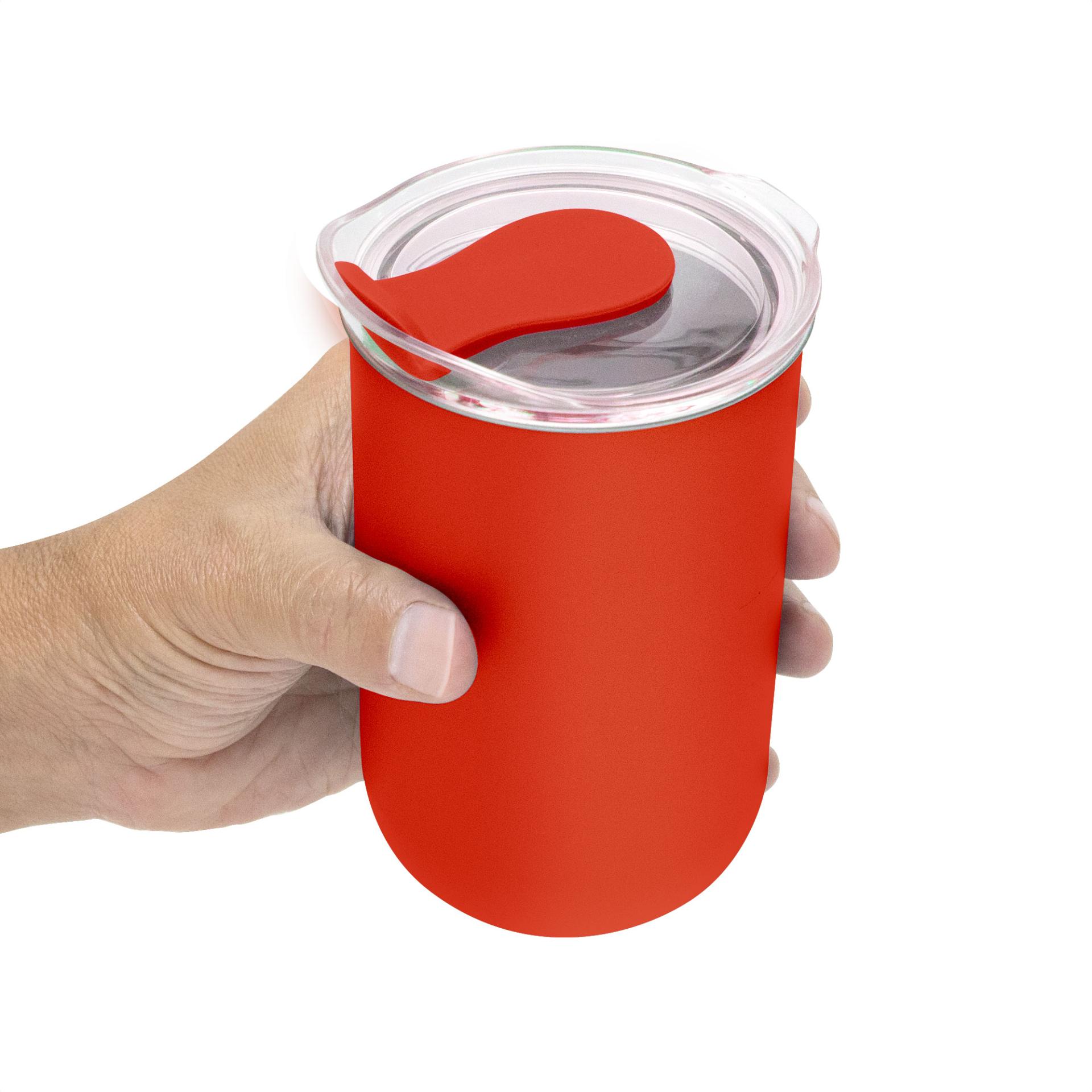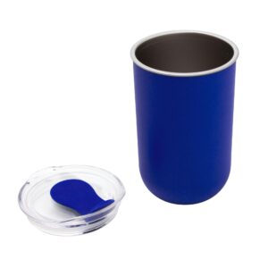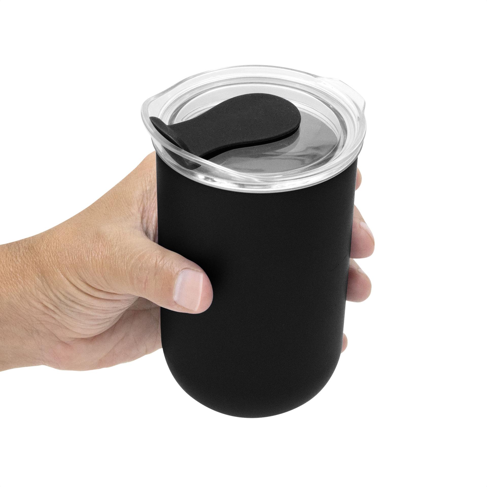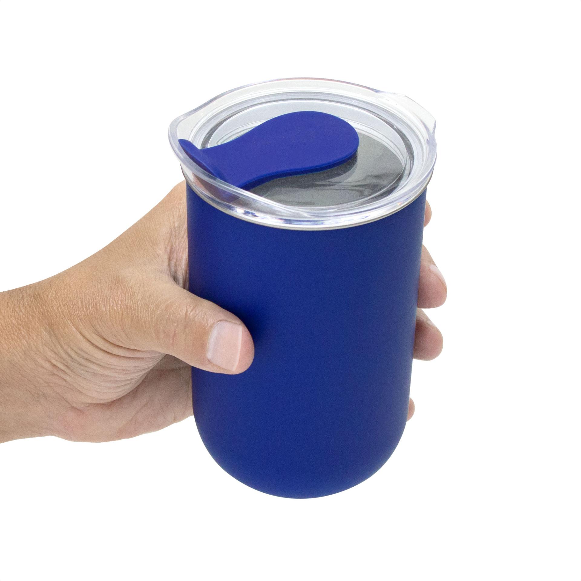 Elegancia y Aislamiento en MovimientoMug doble Pared. Interior de acero inoxidable 304 y exterior de polipropileno. Pintura acabado mate. Tapa plastica transparente a presion con anillo de silicona y cierre de silicona a tono con el color del cuerpo. Mantenga el tapon abierto si utiliza agua caliente.Medidas: Ø 7,7 x 13 cm. Capacidad: 350 ml. Materiales: Acero inoxidable, silicona, polipropileno y poliestireno. Presentacion: en caja de regalo kraft