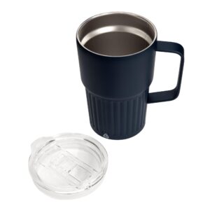 Diseno texturado para mejor agarre.Mug doble pared con asa, sellado al vacio. Mug con aislamiento termico. Tecnologia vacuum. Interior en acero 304 reciclado y exterior en acero 201. Tapa de poliestireno con anillo de silicona. Asa metalica. Pintura acabado semi mate. Parte inferior texturada. Mantiene hasta 12 hs la temperatura de las bebidas calientes y 24 hs de las bebidas frias.Medidas: Ø 8,7 cm x 14 cm. (no incluye asa)Capacidad: 450 ml. Materiales: Acero inoxidable, acero inoxidable reciclado y poliestireno. Presentacion: en caja de regalo Kraft
