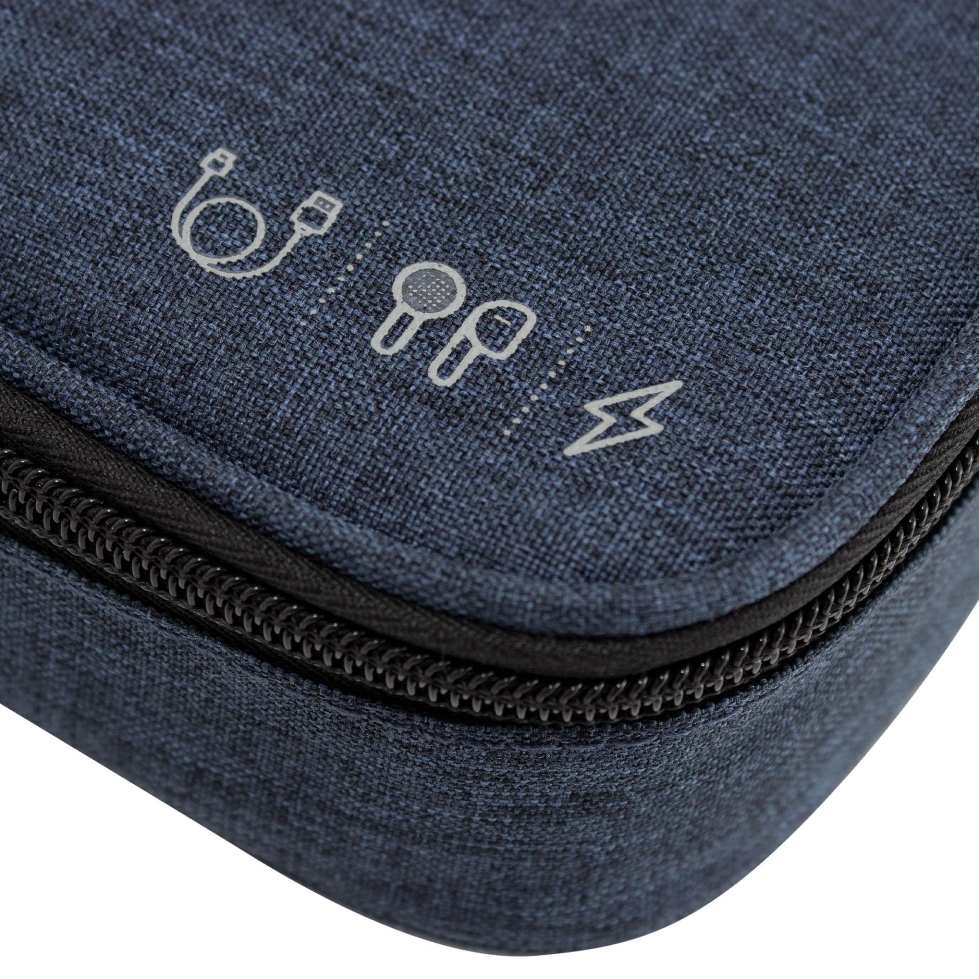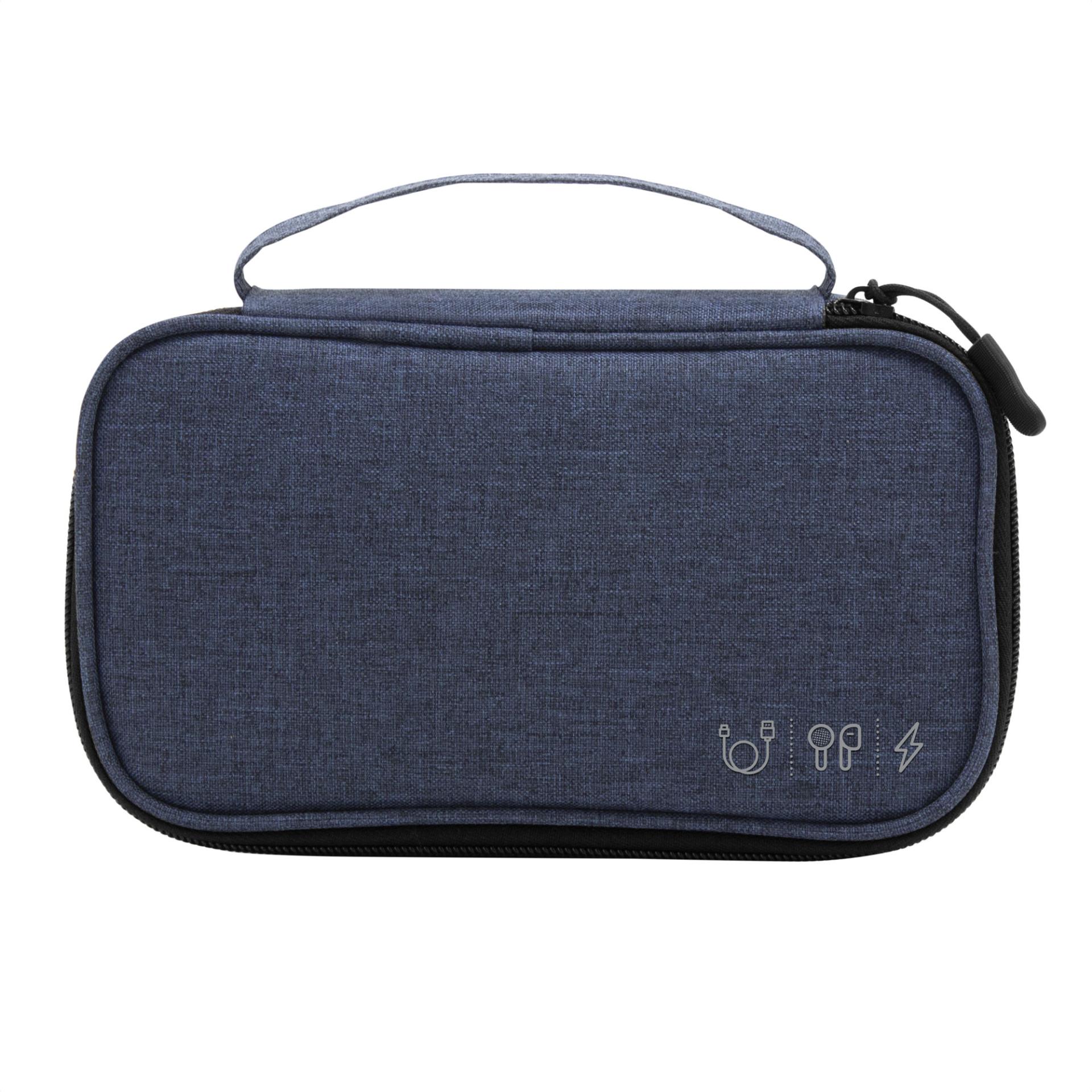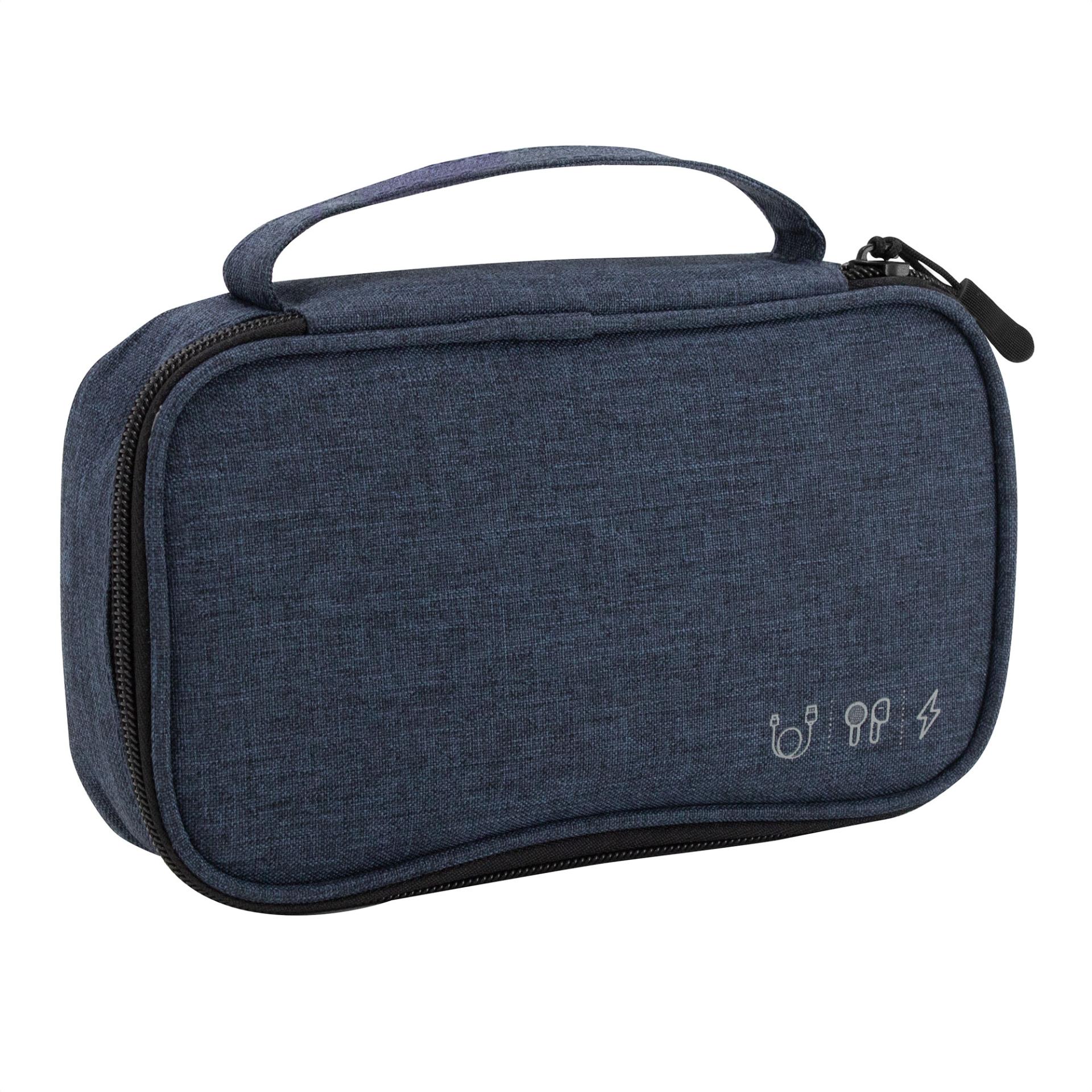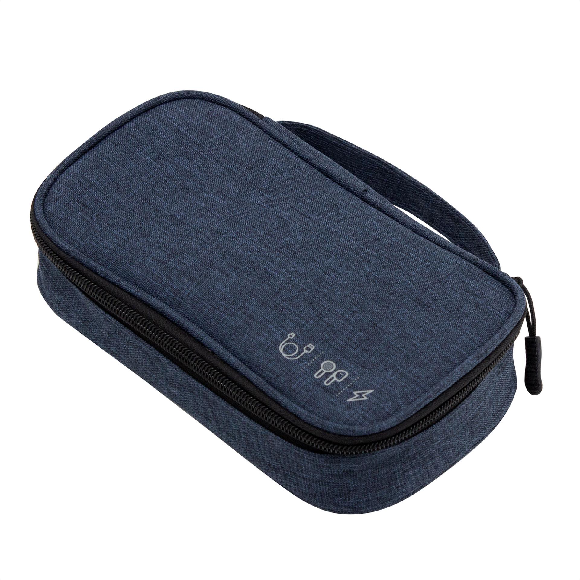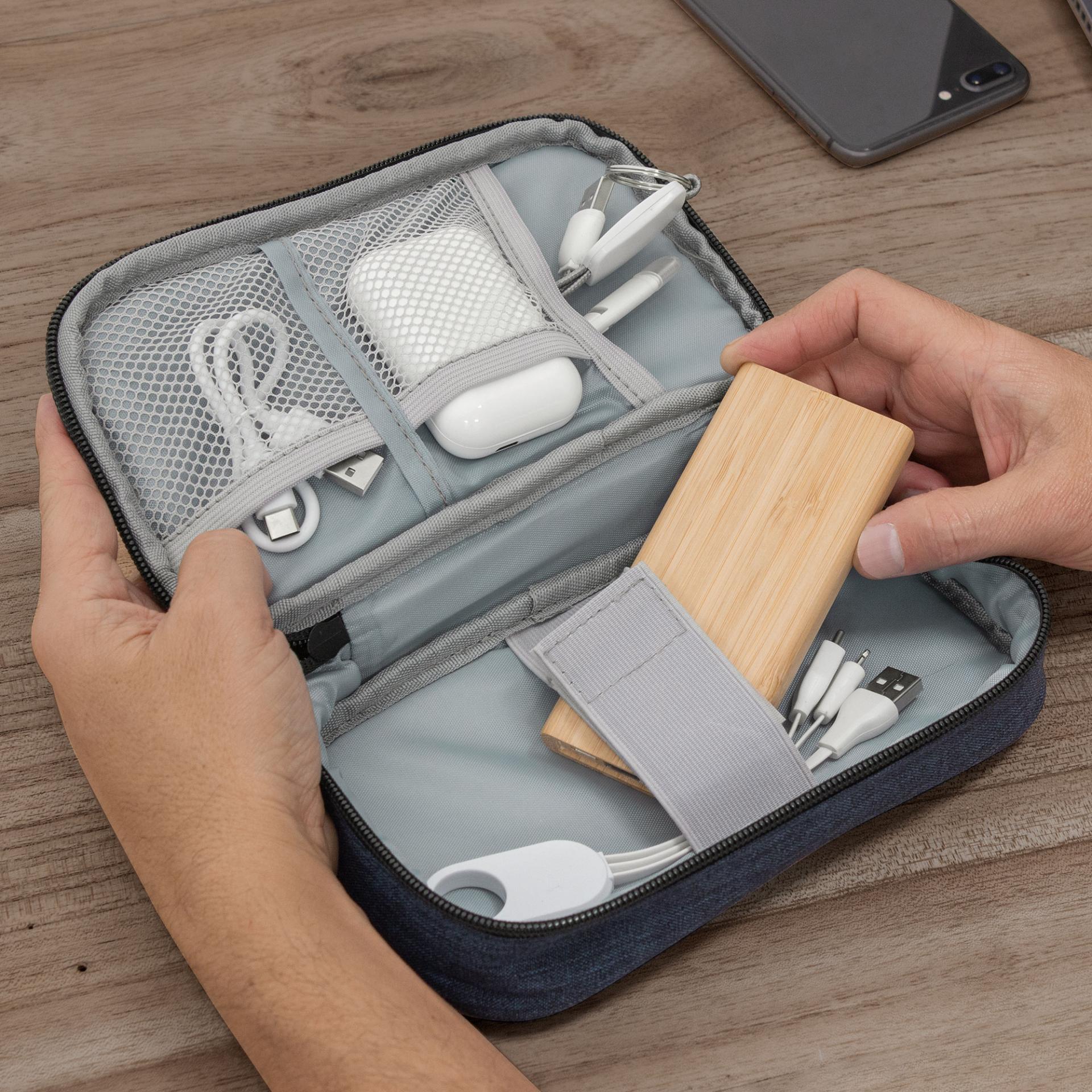 Ordena tu espacio con estiloOrganizador de cables. Estructura acolchada. Asa para transportar. Compartimento principal con cierre con tirador engomado. Interior forrado. En uno de sus lados cuenta con un bolsillo principal y dos pequenos de red, y en el lado contrario tiene un elastico con velcro multiproposito.Medidas: 20 x 12 x 5,3 cm. Material: Poliester 300D
