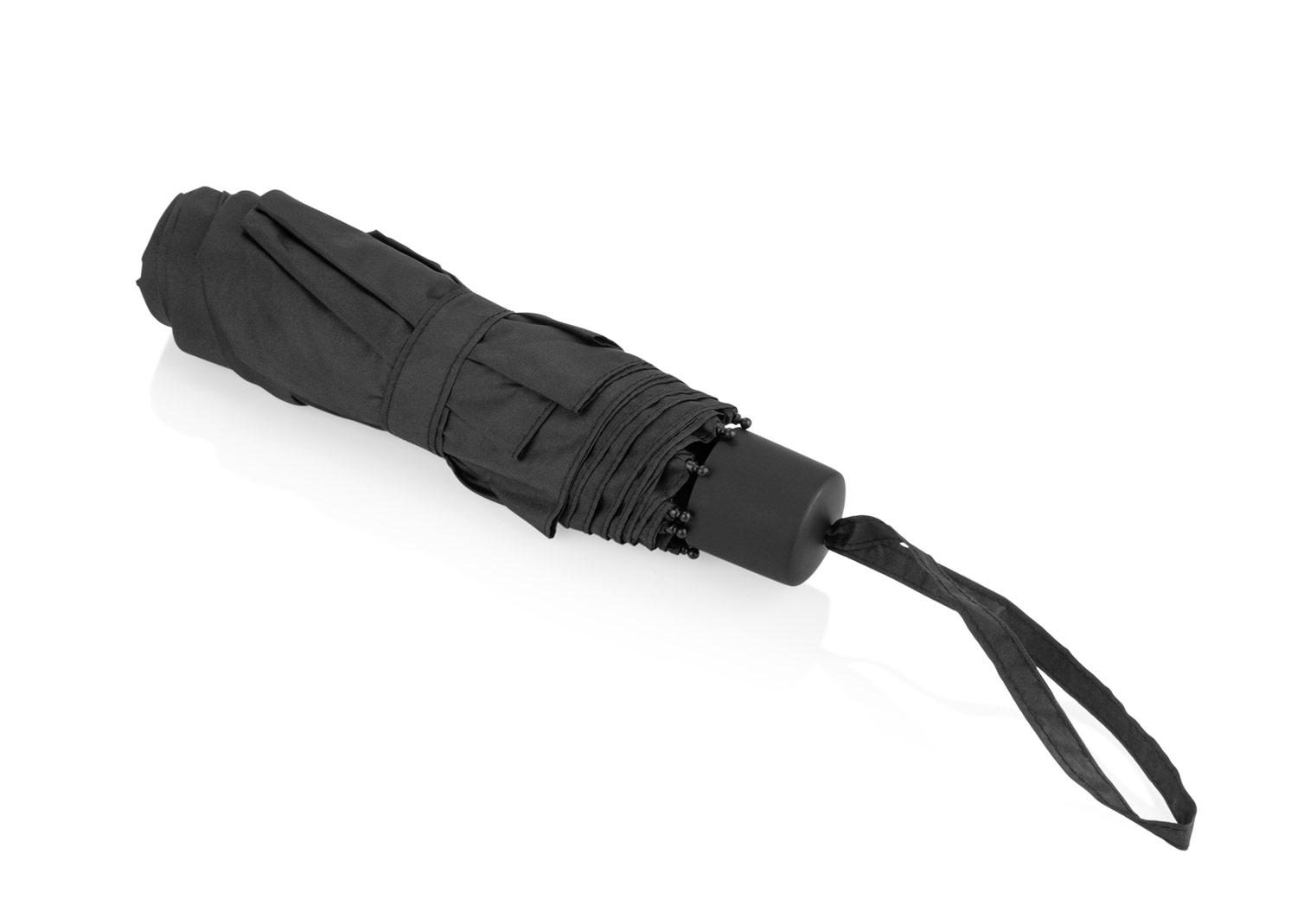 Paraguas plegable de 21 pulgadas con 8 cascos en 3 secciones, apertura y cierre manual completo. Su estructura combina marco chapado negro con 2 secciones de fibra de vidrio, ofreciendo resistencia y flexibilidad. Con tela pongee 190T, cada unidad incluye una bolsa de compras (29,8 X 35 X 11) del mismo material, tambien a prueba de viento, disenada para llevar el paraguas junto al bolsillo. El mango es de plastico PP con acabado de goma, comodo y en colores coordinados || Material: Pongee 190T + PP + Fibra de Vidrio + Goma || Tamaño: Diámetro de 110.5 cm