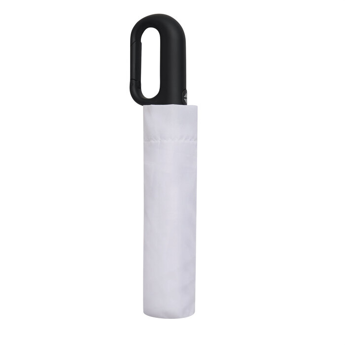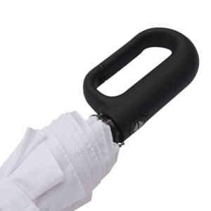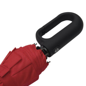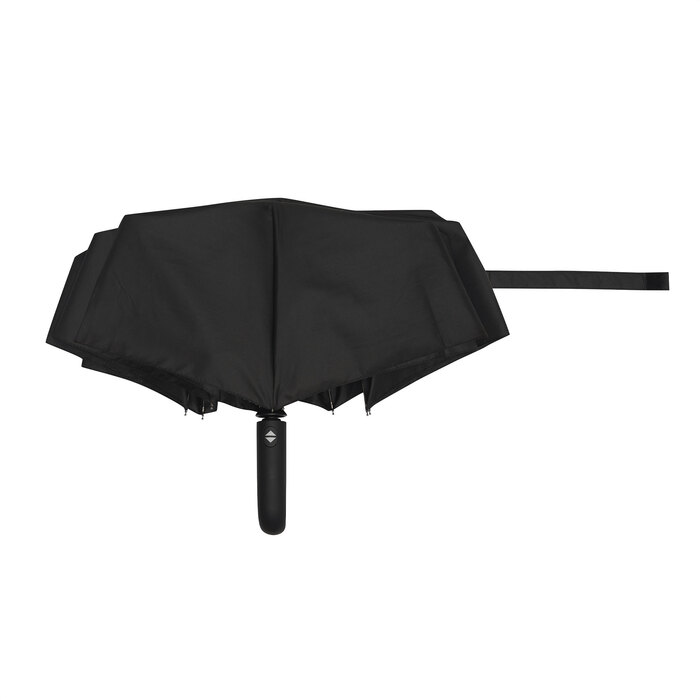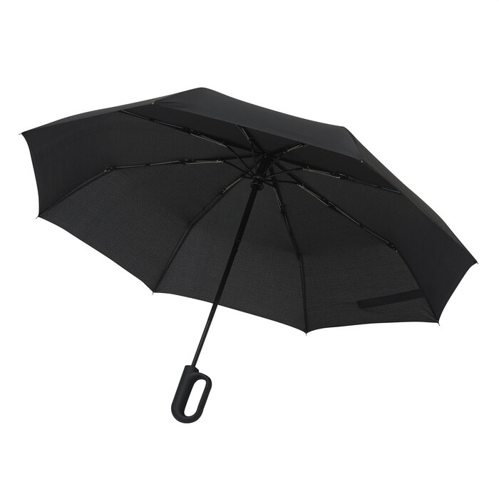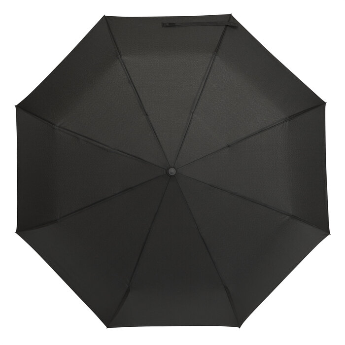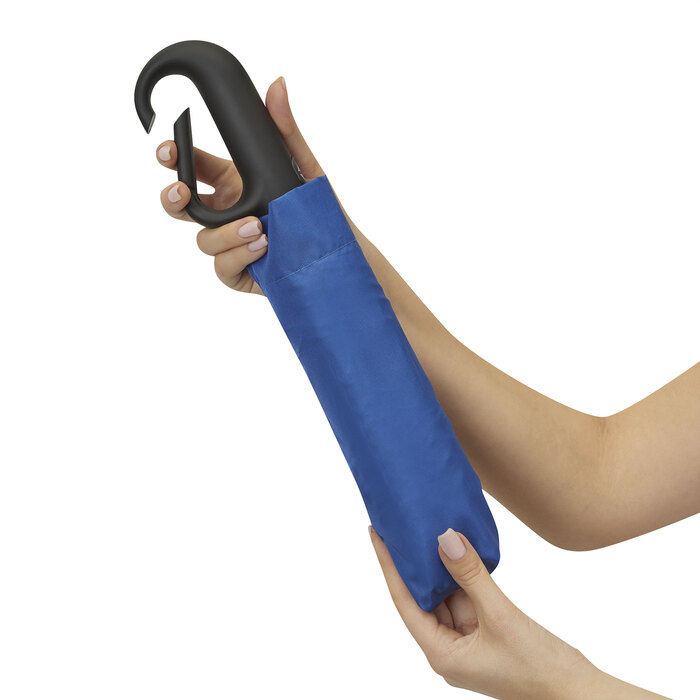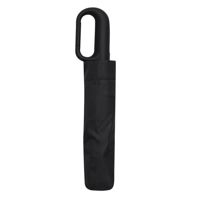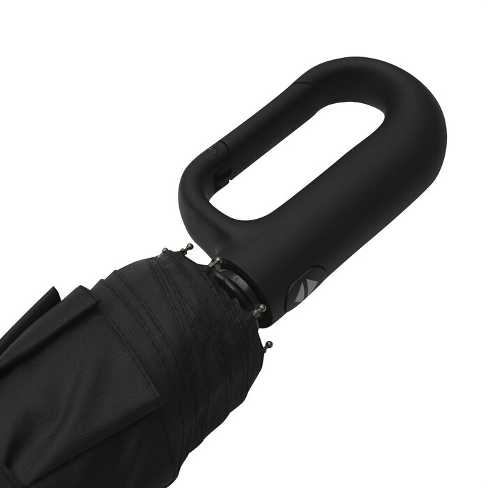 Proteccion inmediata en un clicParaguas APERTURA Y CIERRE AUTOMATICO. Eje y varillas metalicas. Mango con asa y sistema mosqueton, de plastico engomado color negro mate. Boton a presion. Cierre con correa de velcro. Medidas: Ø 97 cm. 8 gajos. Ancho gajo 36,5 cm. Largo cerrado 33,5 cm. Largo abierto 60 cm. Materiales: Poliester pongee 190T, metal y plastico