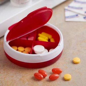 Pastillero con 4 compartimentos || Material: Plástico || Tamaño: 7 cm Diámetro