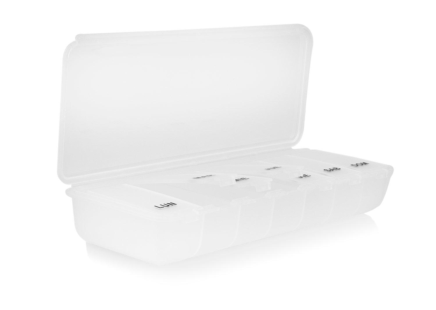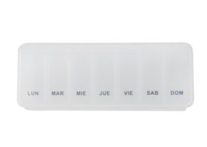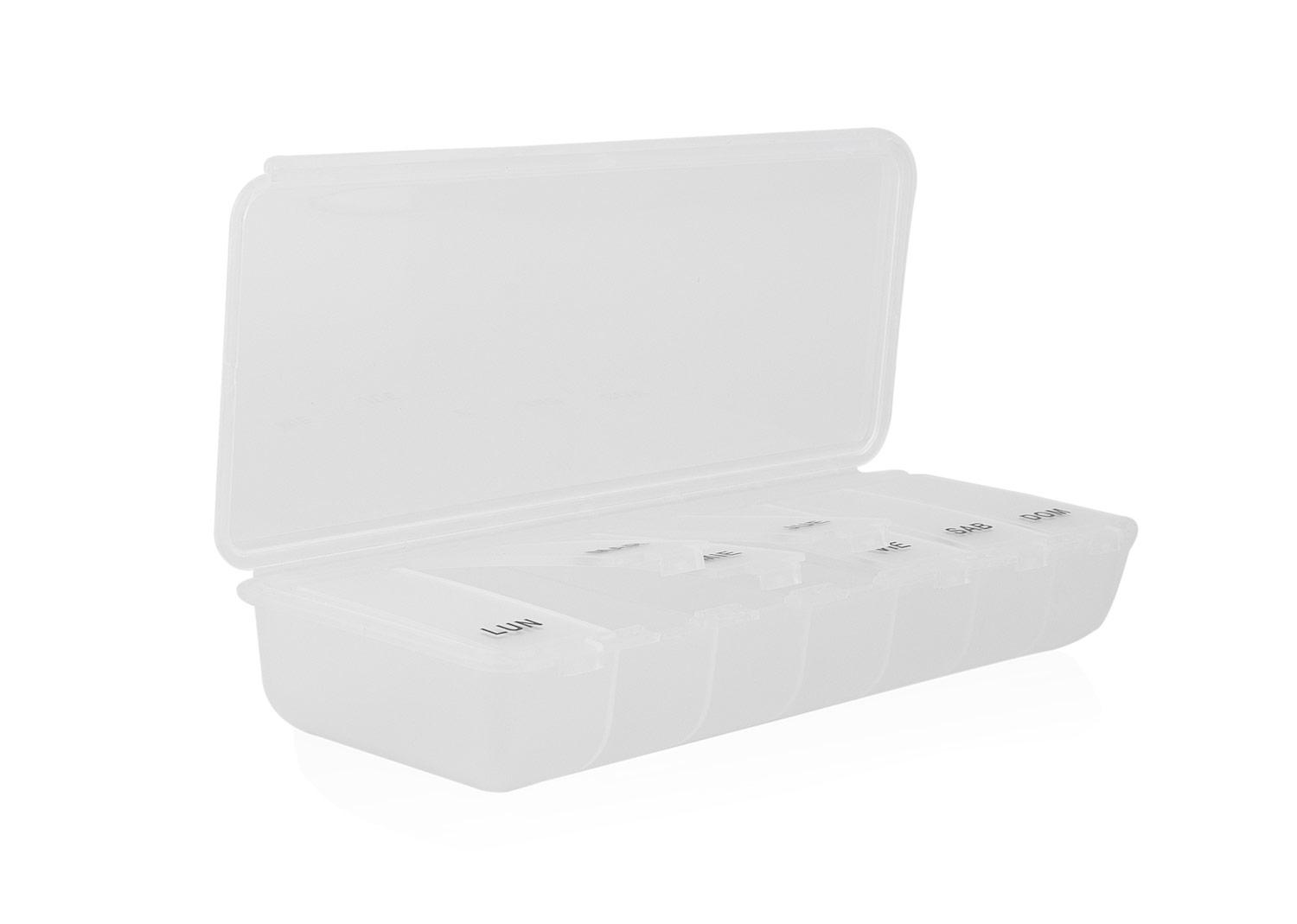Organizador practico para medicamentos, disenado con 7 compartimentos individuales (6,3 X 2,1) para cada dia de la semana. Fabricado en plastico transparente con tapa abatible, permite visualizar facilmente el contenido y mantener el control diario de la dosis. Ideal para uso personal en casa o durante viajes || Material: PP || Tamaño: 6.6 x 16.9 x 3 cm