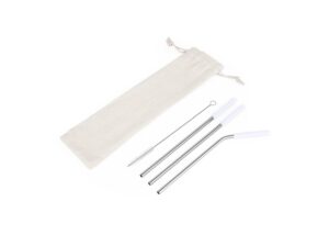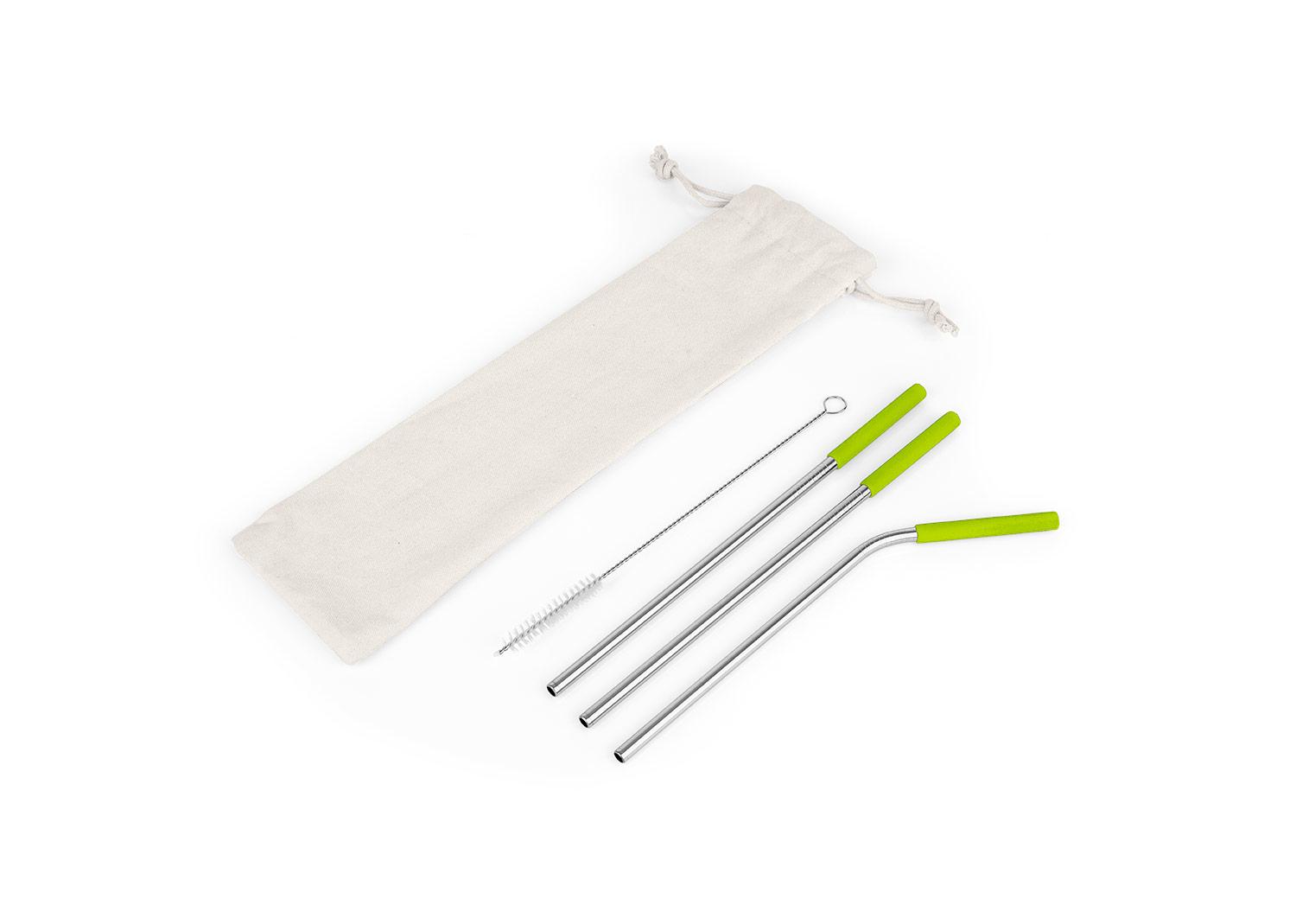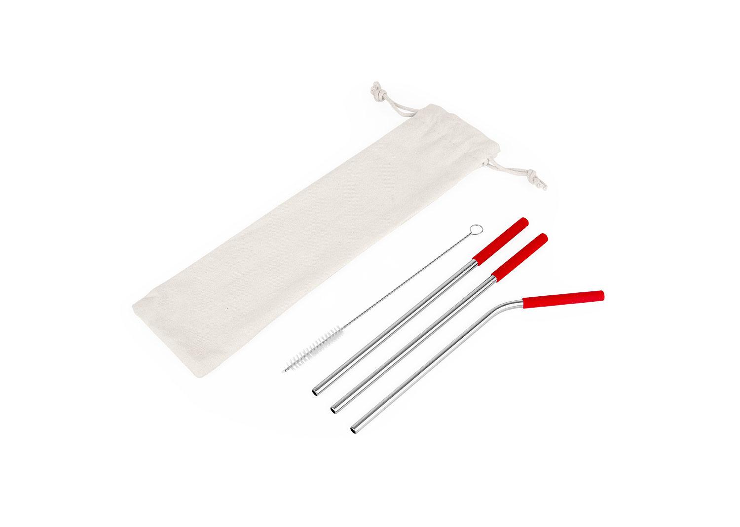Set de pitillos ecologicos x 3 und (uno de ellos es curvo), con boquilla en silicona, cepillo para limpiarlos y estuche textil con cordon. Producto de uso personal. No se aceptan devoluciones || Material: Acero inoxidable + Silicona || Tamaño: 7.00 x 23.00 x 0.50 cm