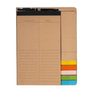 Planeador de prioridades y tareas. En su interior incluye un boligrafo metalico, un sobre de papel para almacenar o proteger documentos, un block de 70 hojas de papel Kraft con diseno de raya, 3 mini notas adhesivas y banderines adhesivos en cinco colores diferentes, con 25 piezas cada uno. Se mantiene cerrado de manera segura gracias a su banda elastica. Cubierta rigida al exterior || Material: Curpiel / Papel || Tamaño: 17.5 x 22.5 x 1.7 cm