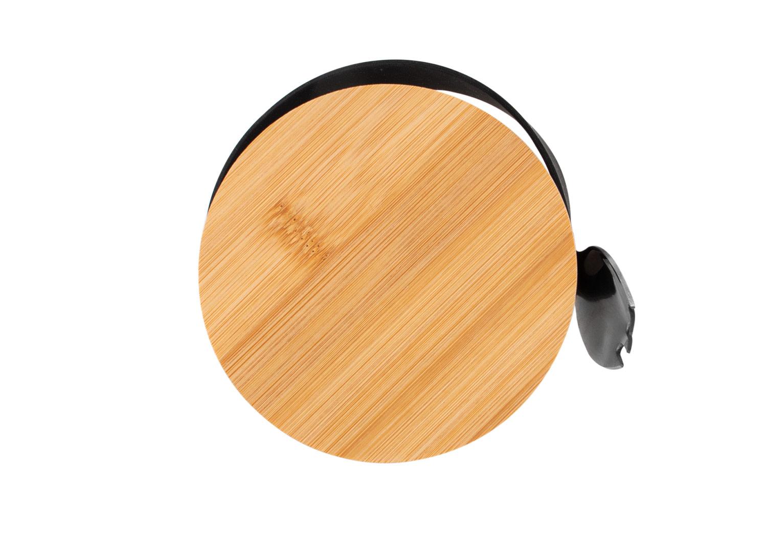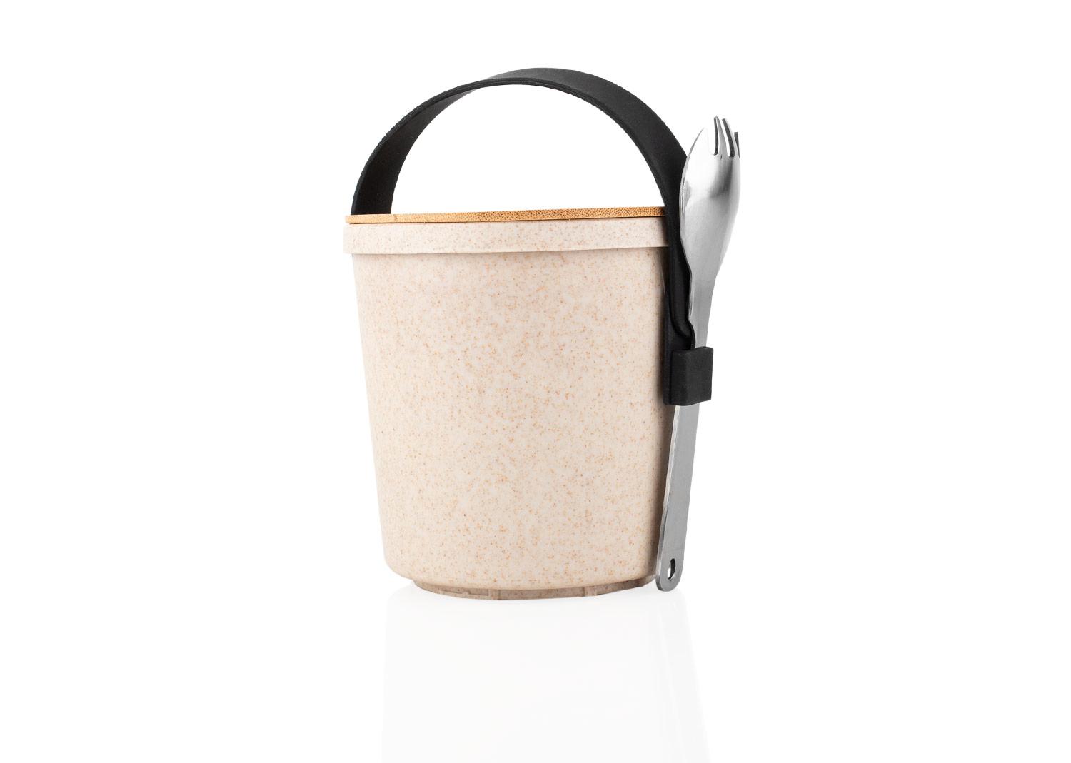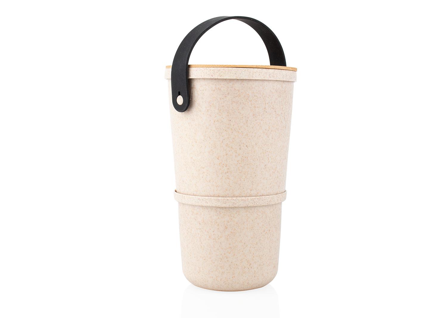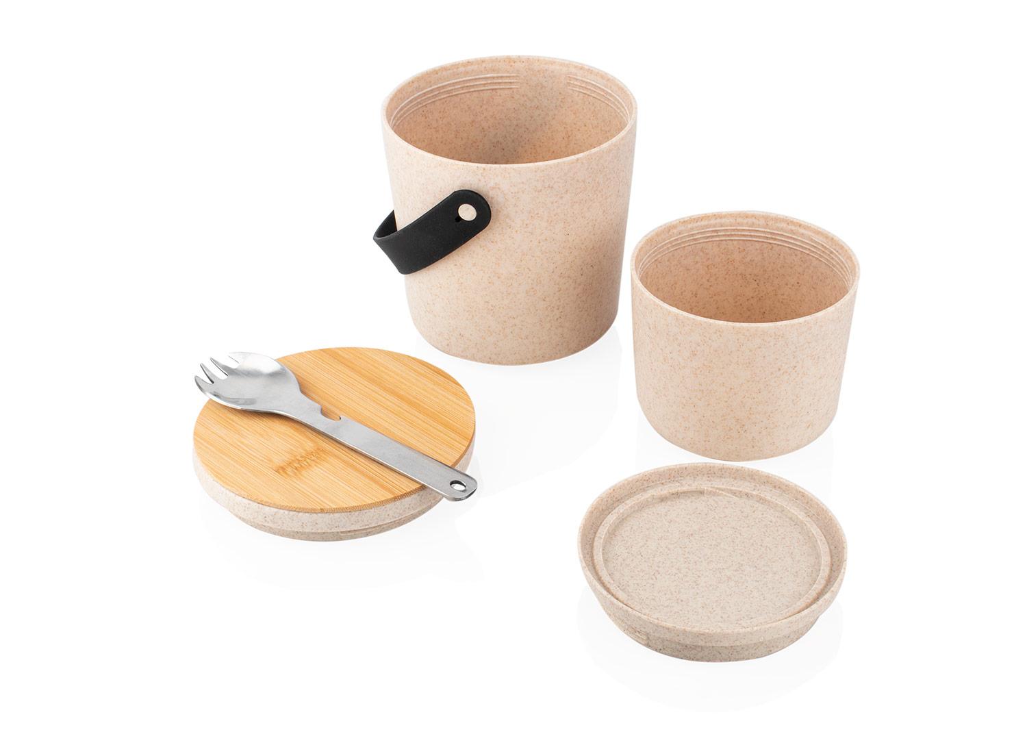De plastico con tapa de bambu, disenada con asa integrada para facilitar su transporte. Incluye un portacomidas interno con tapa (8,4 X Ø 9,5) sin tapa: (7,5 X Ø 9,5), ideal para separar y organizar los alimentos. Las tapas cuentan con cierre giratorio que asegura un ajuste firme. El tenedor (3,7 X 14,5), ademas de ser funcional, incorpora un destapador de botellas y puede colocarse en el asa para mayor practicidad. Una solucion versatil y ecologica para llevar tus comidas a cualquier lugar || Material: PP + Bambú || Tamaño: Diámetro de 10.7 cm