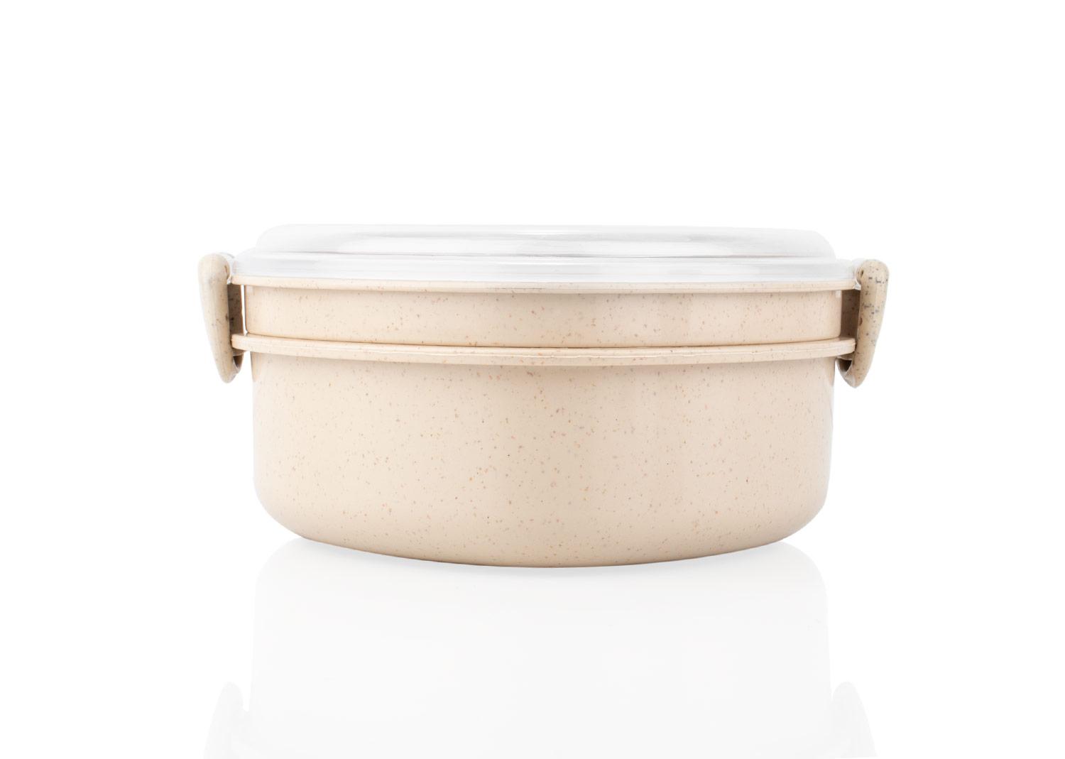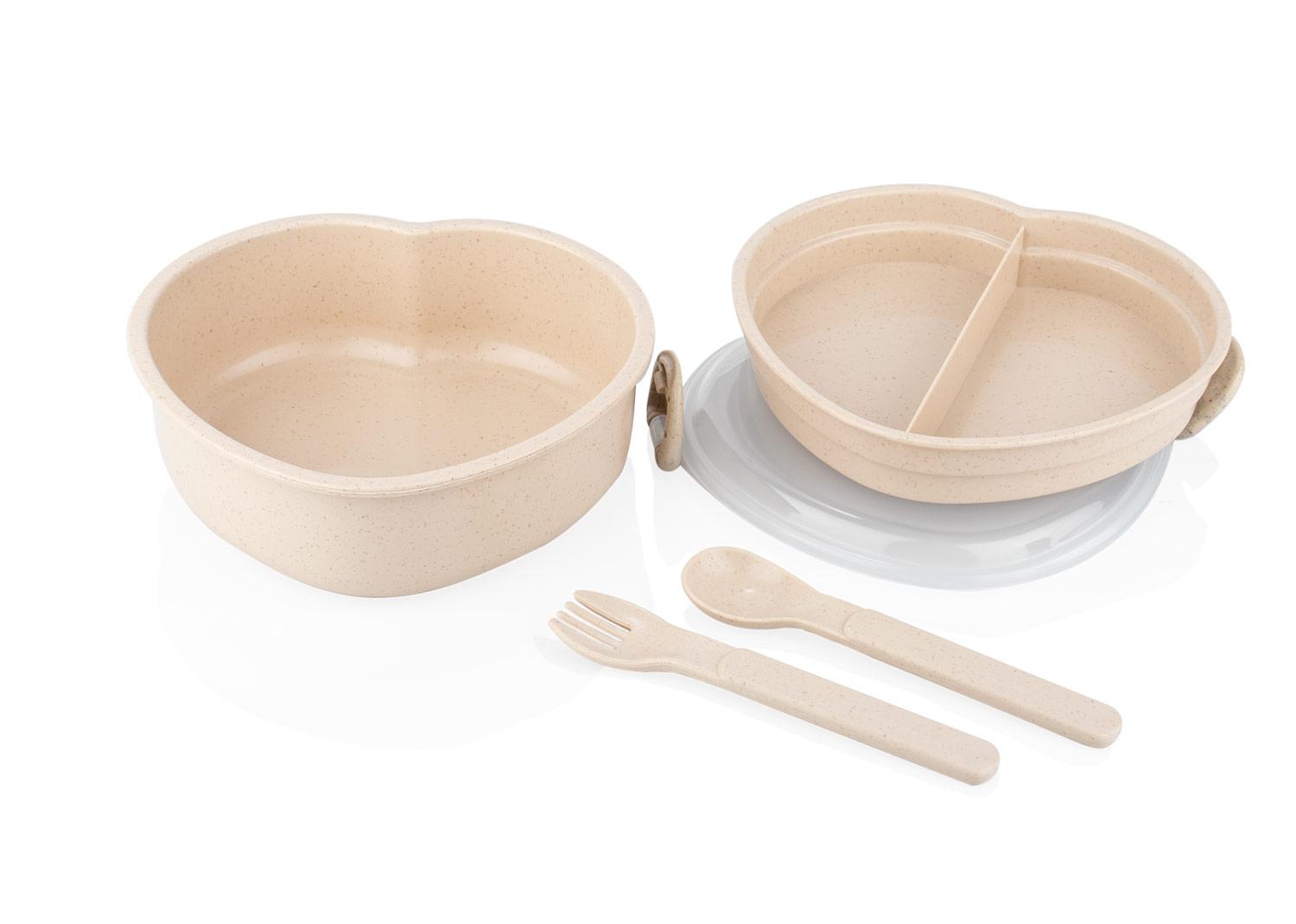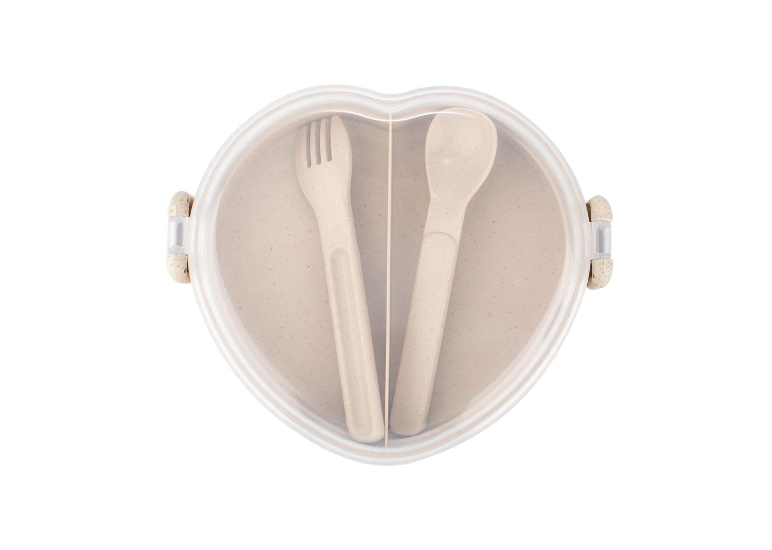 Diseno con forma de corazon, fabricada en material de paja de trigo con tapa de PP transparente. Incluye cuchara (2,7 X 12,2) y tenedor (2,3 X 12,2) del mismo material y color que la base, ubicados en un compartimiento adicional (14,2 X 13) para mayor organizacion. La tapa cuenta con cierres laterales que aseguran un cierre firme. Una opcion ecologica y funcional para transportar tus comidas con estilo || Material: PP + Paja de trigo || Tamaño: 15.3 x 13 x 7 cm
