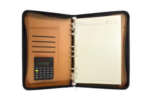 Organizacion y funcionalidad en un solo diseno. Esta libreta cuenta con: cubierta y contraportada en PU resistente, 100 hojas interiores de 80 g/m2 con impresion de lineas (14,2 X 20,8), carpeta interna (12 X 19), bolsillos para tarjetas y documentos, inserto para boligrafo, calculadora integrada, correa de cierre para mantener el contenido seguro. Ideal para reuniones, trabajo o estudio, combina estilo profesional con practicidad || Material: PU + Papel 80 gr || Tamaño: 18.5 x 25.2 x 3.4 cm