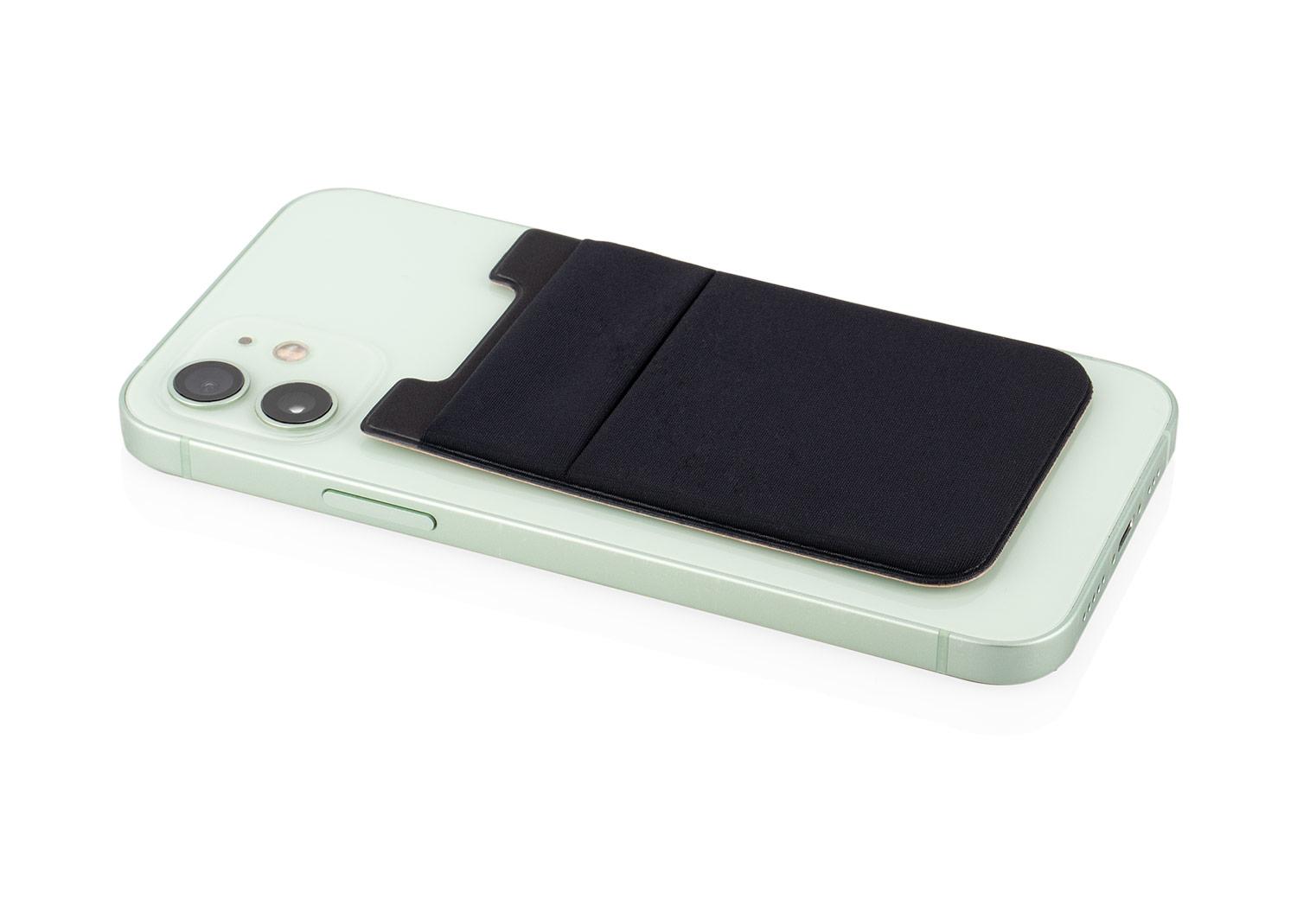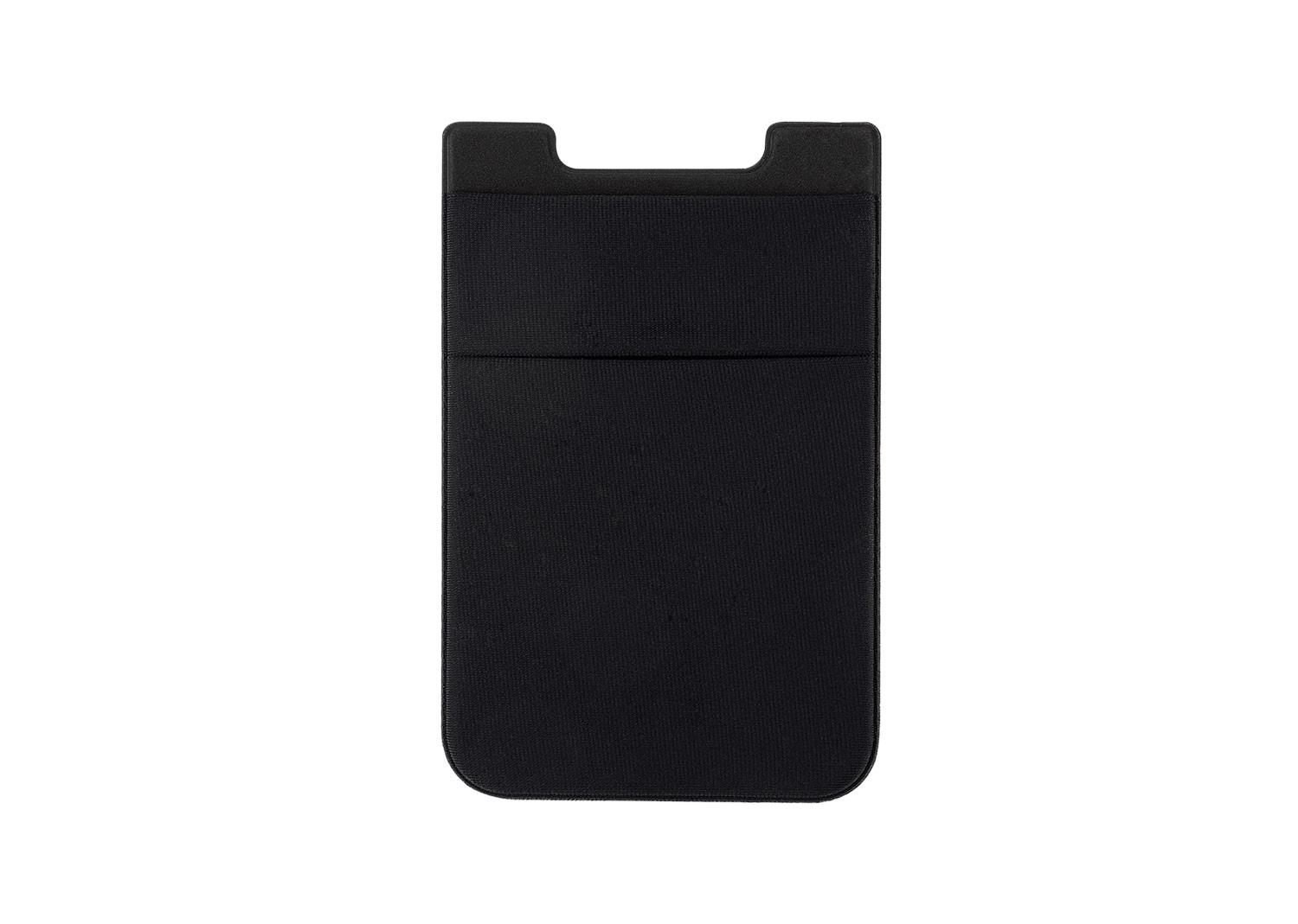 Practico portatarjetas fabricado en lycra flexible, disenado para adherirse a la parte trasera del telefono movil mediante adhesivo resistente (marca 3M). Cuenta con dos compartimientos: uno frontal y otro central, ideales para guardar tarjetas, documentos o billetes. Su material elastico permite un ajuste seguro y comodo || Material: Microfibra || Tamaño: 6.1 x 9.6 x 0.3 cm
